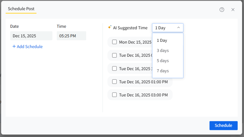 - The Add Schedule button allows you to add multiple time slots in case you wish to publish the post multiple times on the selected day.