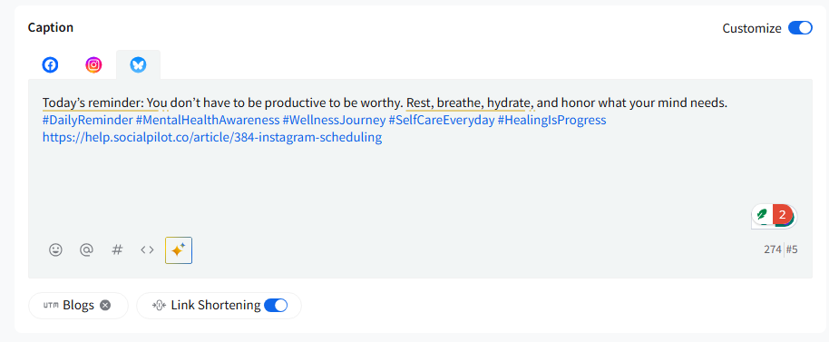 If you switch the URL shortener OFF inside a customized caption, it still applies globally — all platforms will publish the original (unshortened) URLs.