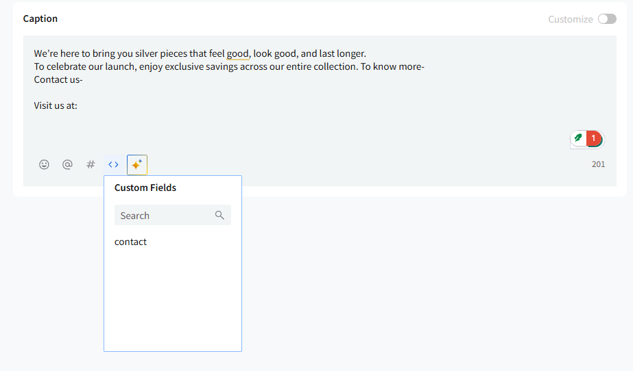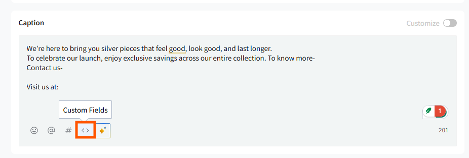 - The Custom Fields icon appears below the caption box along with emojis, mentions, hashtags, and AI Pilot.
