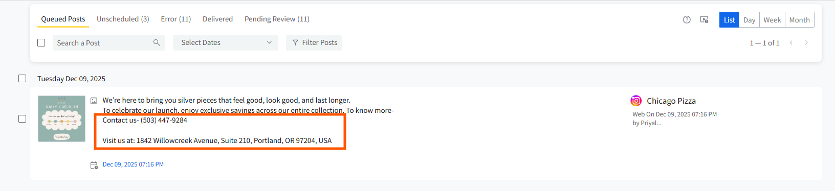 Each post you scheduled for each selected account will contain the unique value that you entered during the setup of that Custom Field when it gets published.