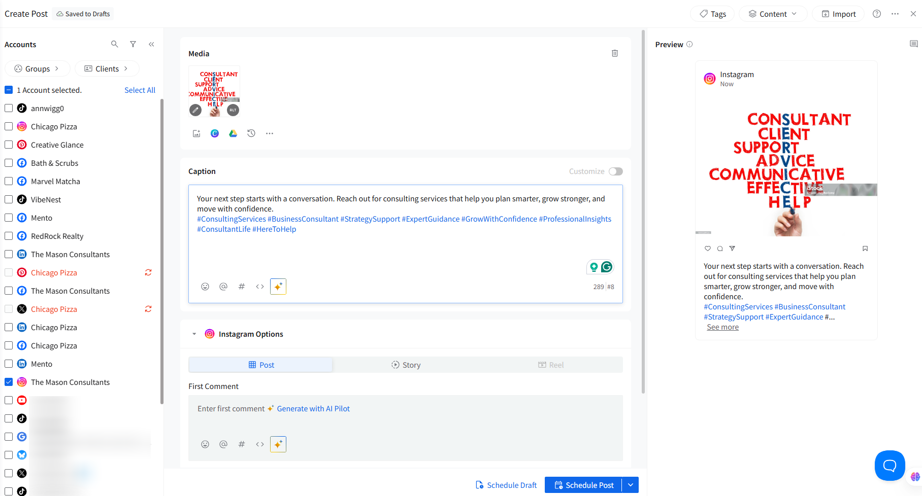 For Instagram Business and Creator accounts, SocialPilot offers direct publishing for Posts, Stories, and Reels.