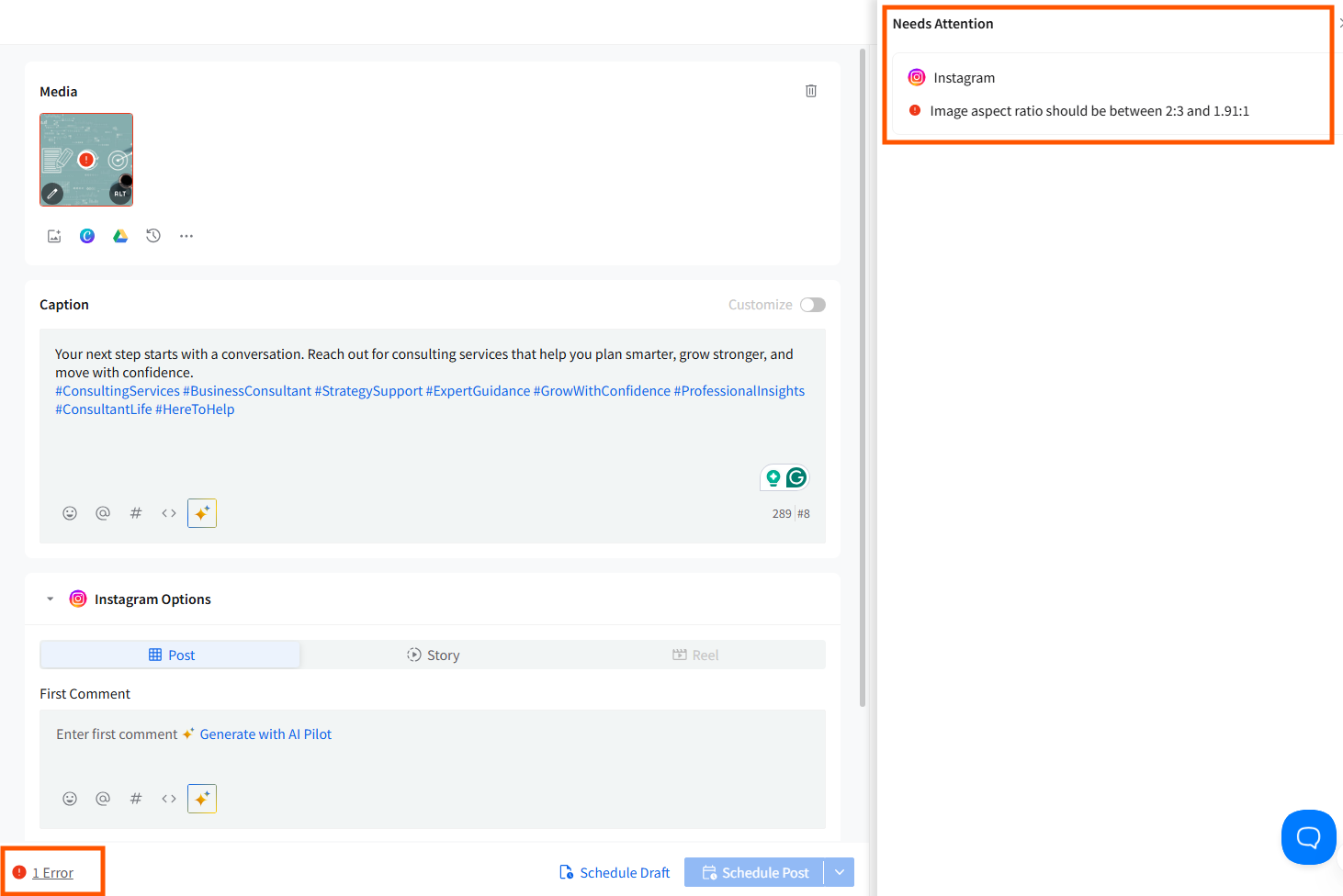 - SocialPilot automatically detects if the post qualifies as a Feed Post and highlights errors and warnings, if any, near the Schedule Post button, which you can check in detail on the right side panel.