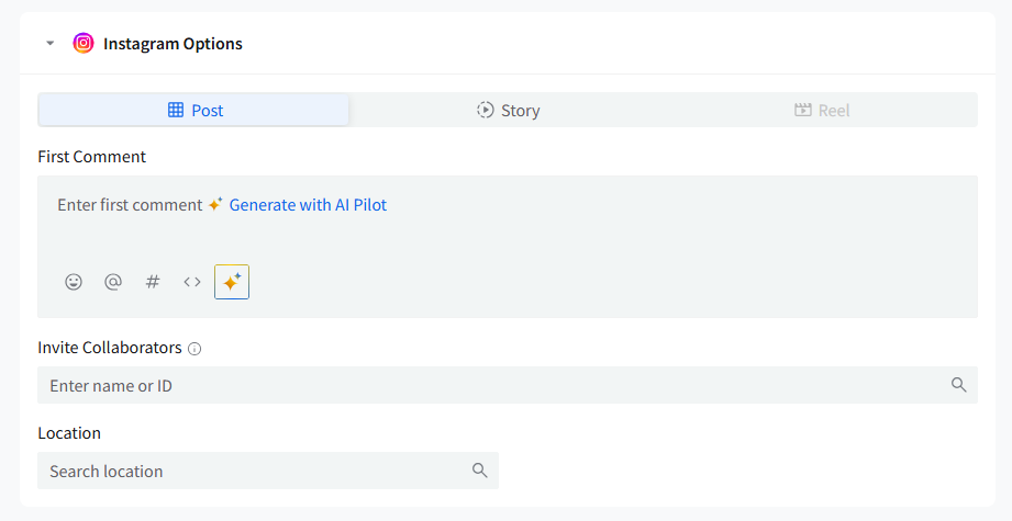 - Add a First Comment, Invite Collaborators, and add Location from the platform options below the caption field if needed.