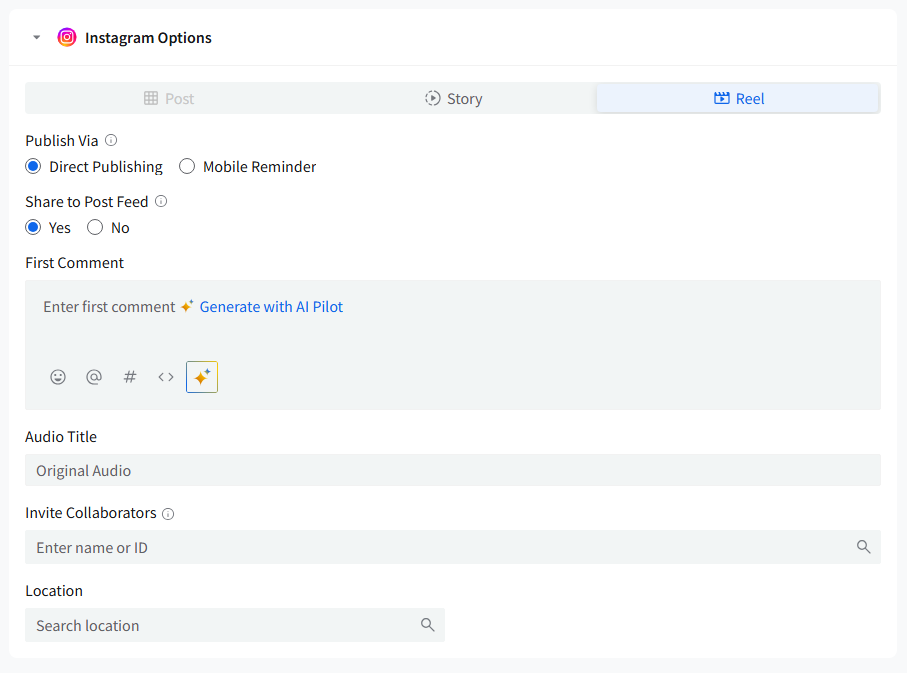 - For the reel, you can add First Comment, decide the Publish Via mode, add Audio Title, invite Collaborators, and add Location from the platform options.