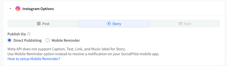 For Instagram Personal accounts, direct publishing is not supported. Instead, SocialPilot offers mobile reminders for posting.