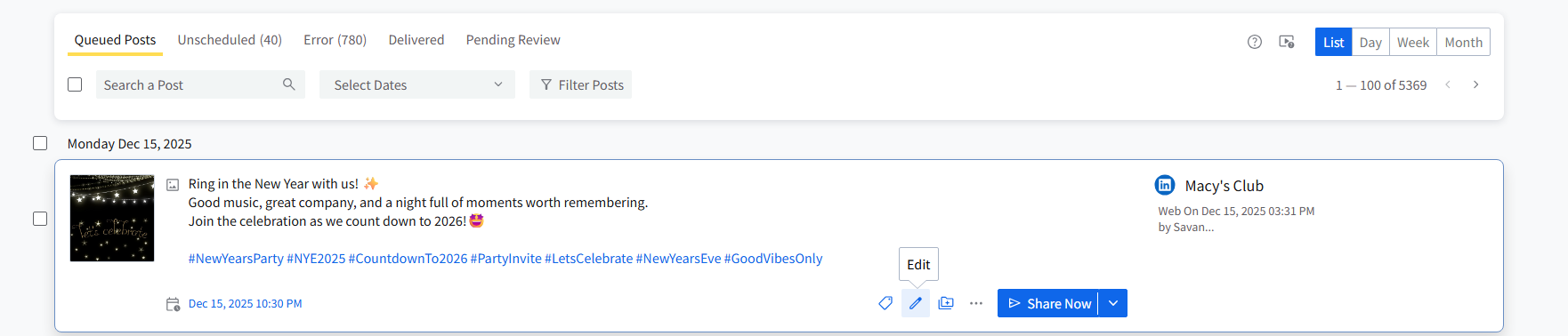 They can search for individual posts from the list of posts that require their approval using filters. They can use keywords, dates, and social media accounts to find a post.