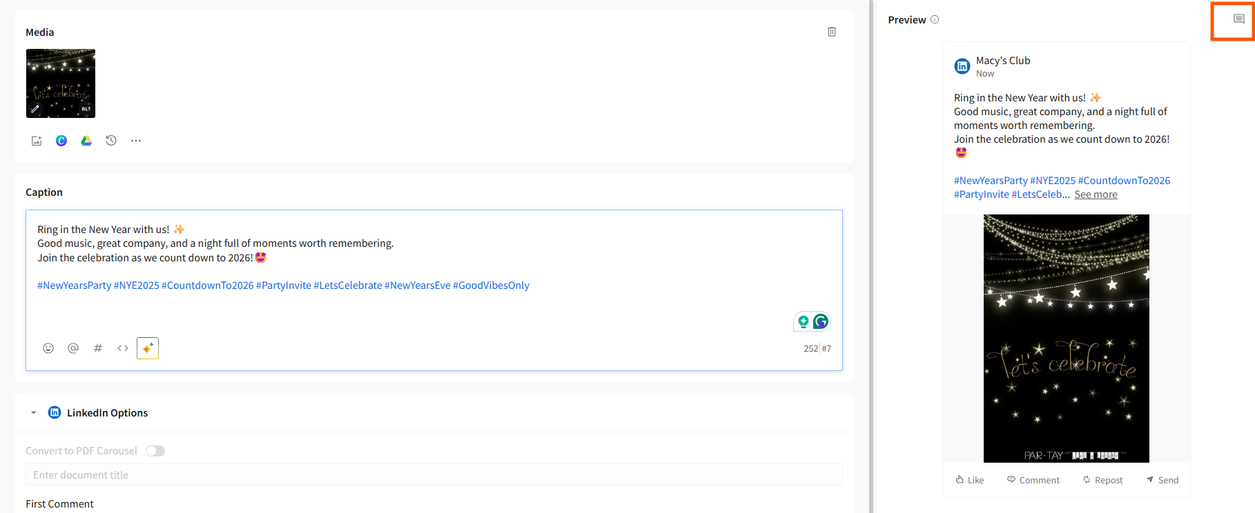 - The post will open in the new Create Post composer, and the Preview Panel will appear on the right side.
