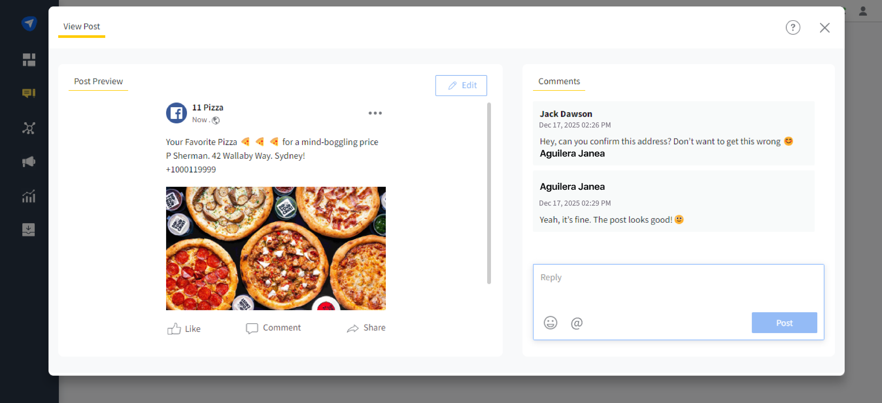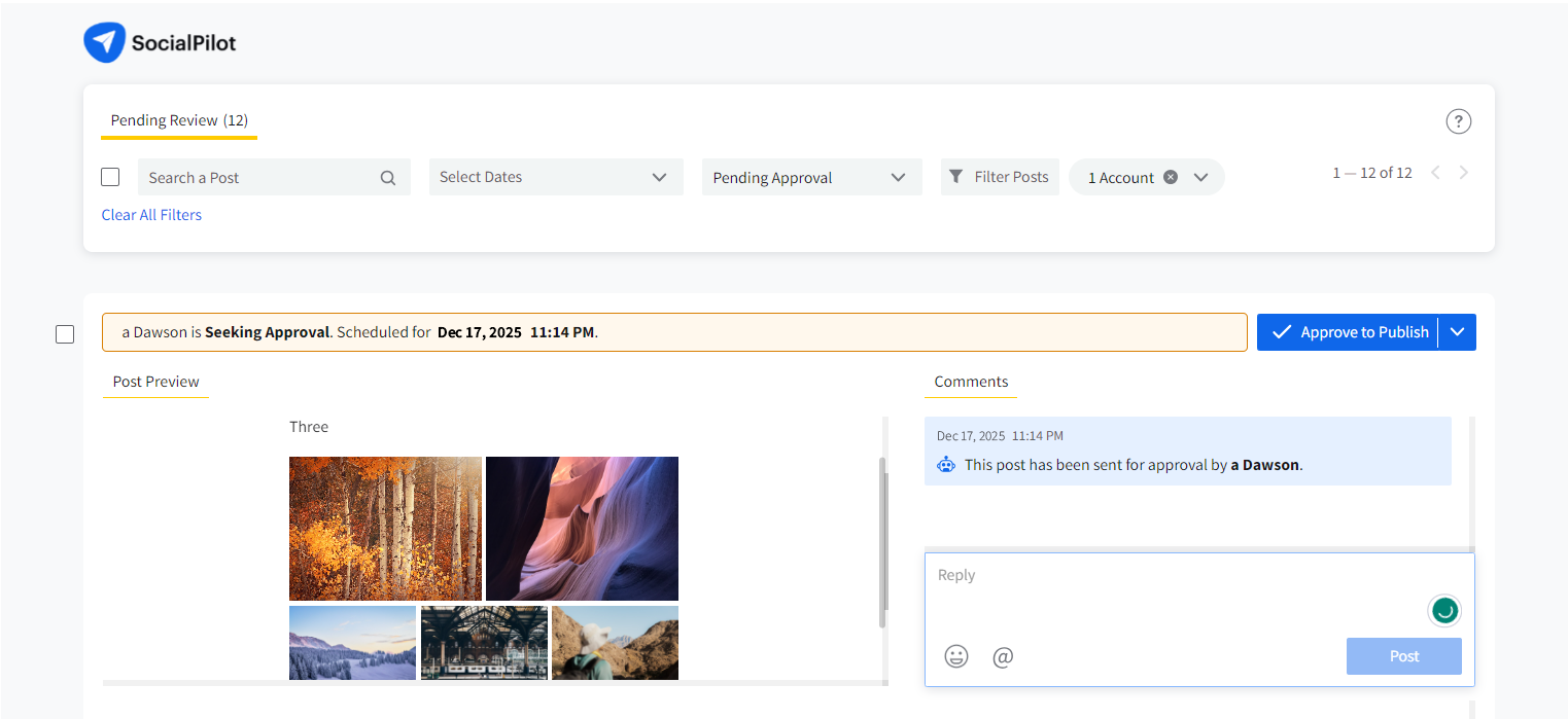 Post-creation is a collaborative process. A single post often goes back and forth between multiple people for edits and approval. SocialPilot facilitates this communication through a designated comment section, enabling collaborators to discuss feedback conveniently. This makes the approval process smoother and less time-consuming.