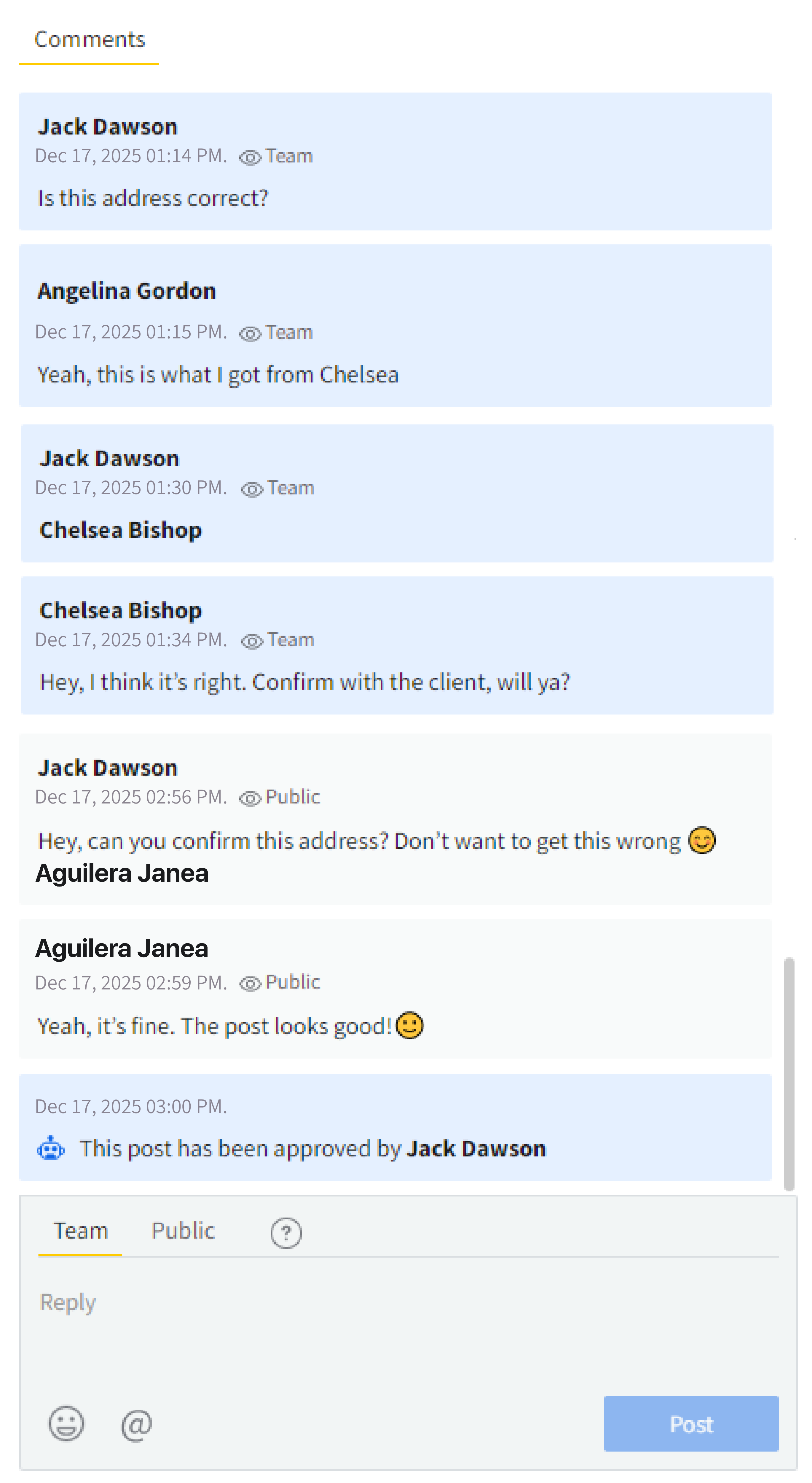 In the same way, a team member can have the same back and forth with a client, discussing changes and opinions on the content in the comments.