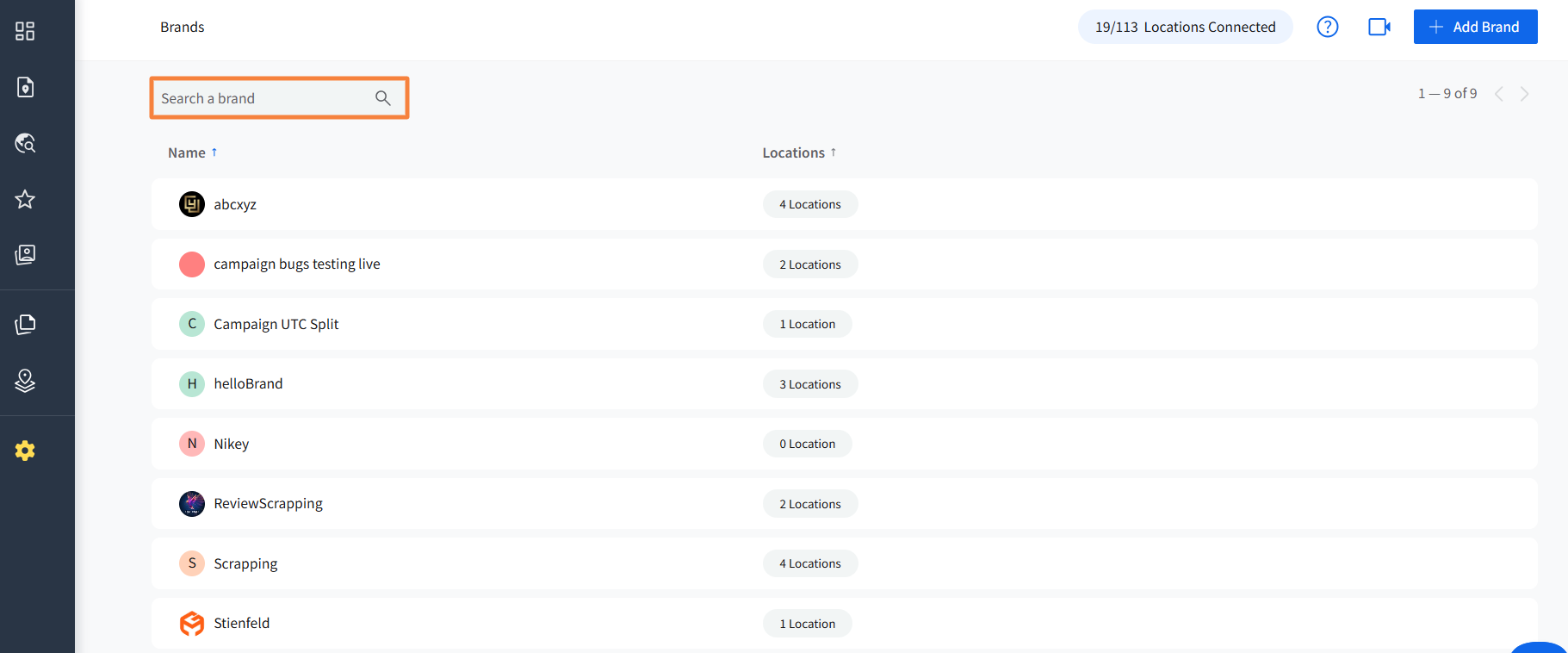 From the dropdown, select Brands. You will now see a list of all the brands you are managing within SocialPilot Reviews. Each brand entry will also display a link indicating the number of associated locations tied to that brand.