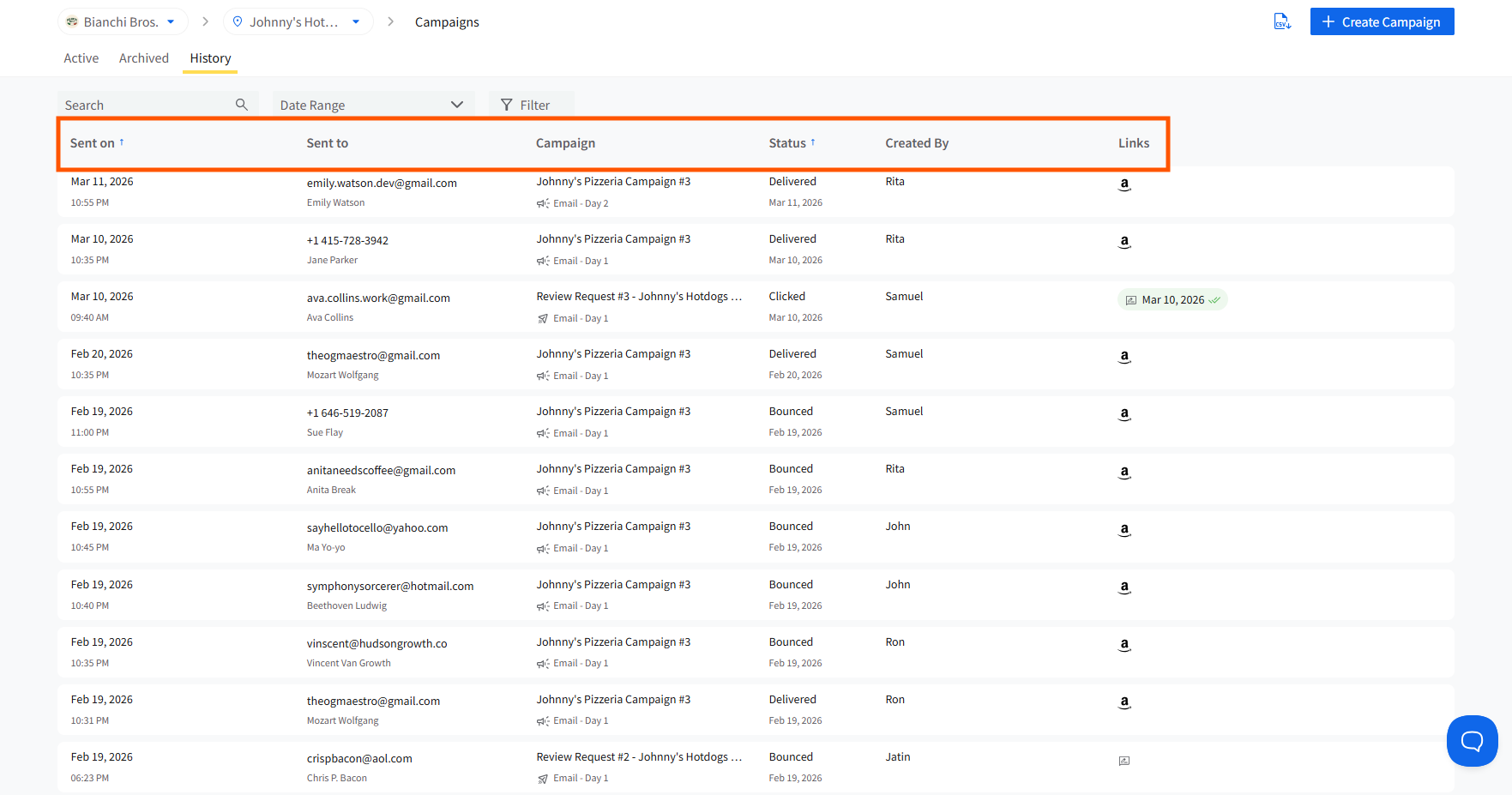 Campaign History allows you to see all the review requests sent through your campaigns and Quick Review Requests in one place.