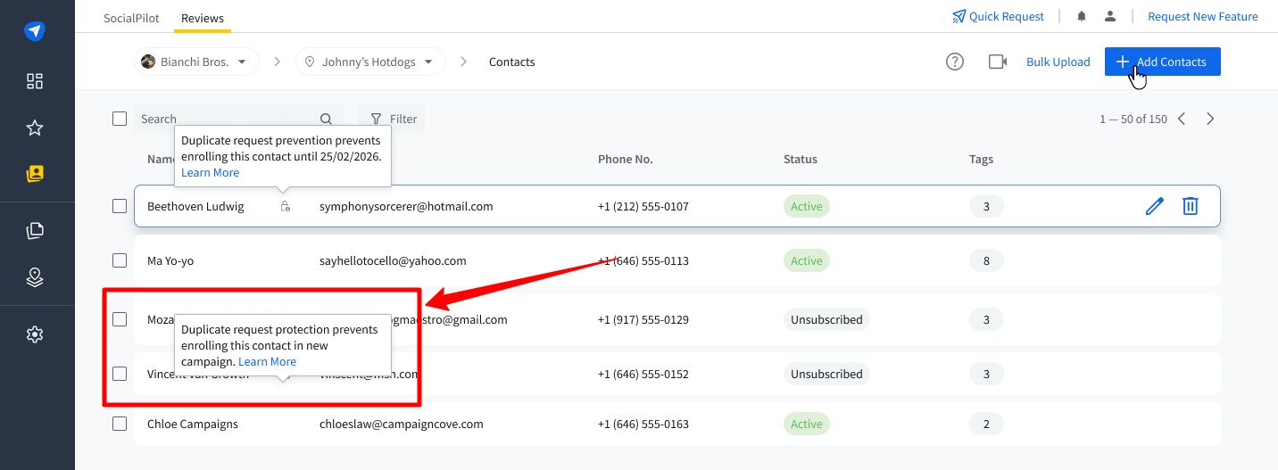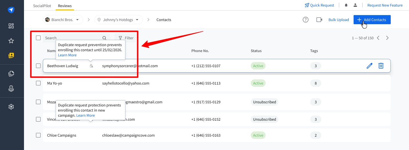 In SocialPilot Reviews, contacts are the recipients of your review request campaigns. These are critical to the success of your marketing efforts, as they directly interact with your requests and provide the valuable feedback you need. You can reach out to these contacts either via their phone number or email ID. Whether you're adding a single contact or importing a batch through a CSV file, SocialPilot makes it easy to organize and execute your review strategies.
