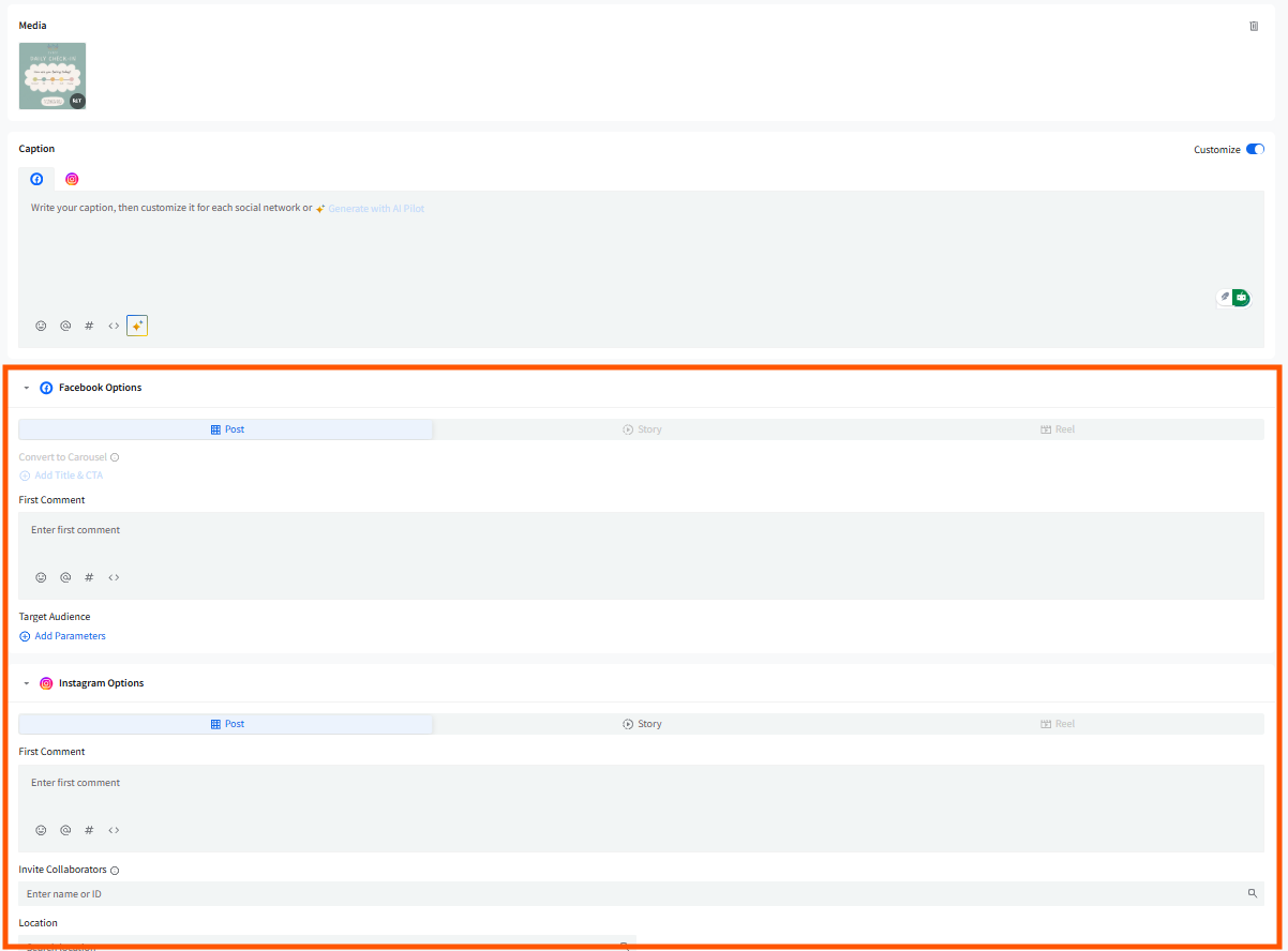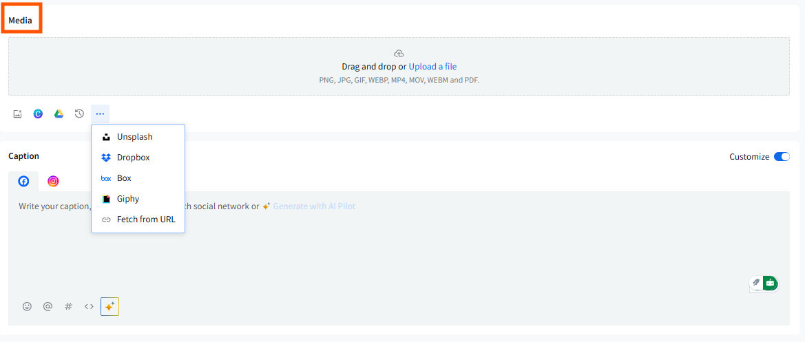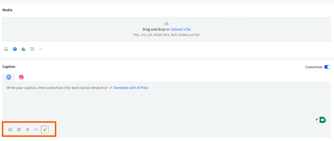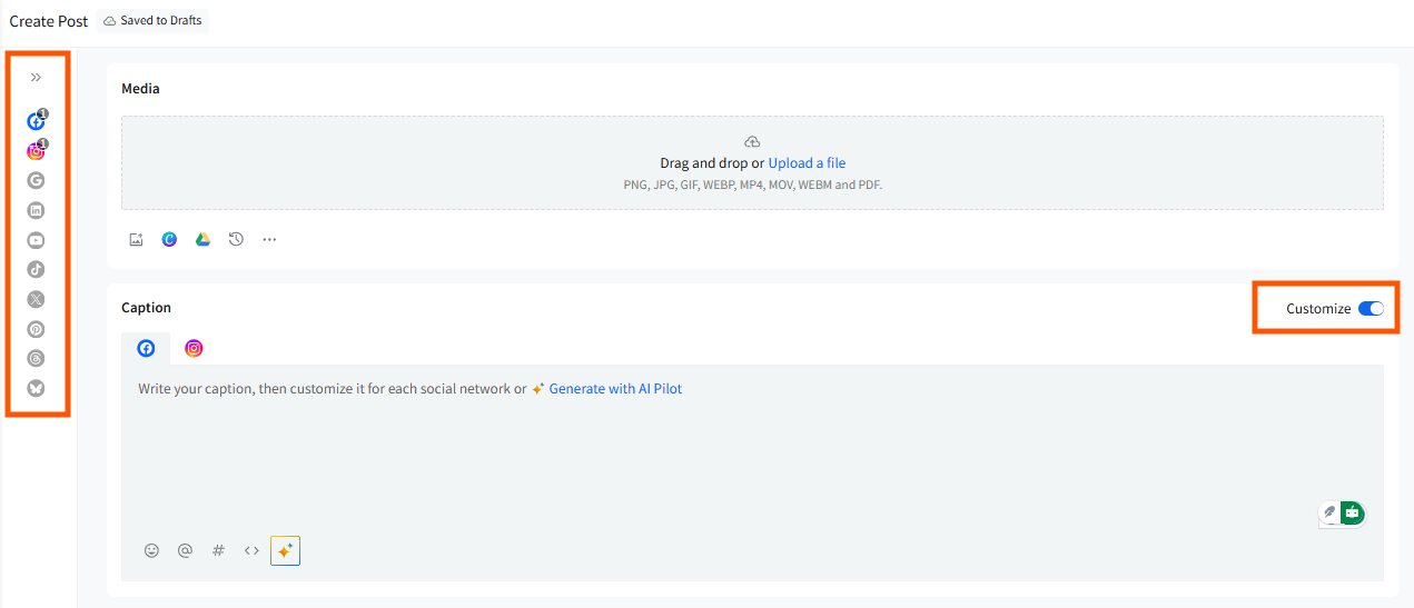 - Write your caption in the center composer. If you want to customize the caption platform-wise, simply turn on the customization toggle.