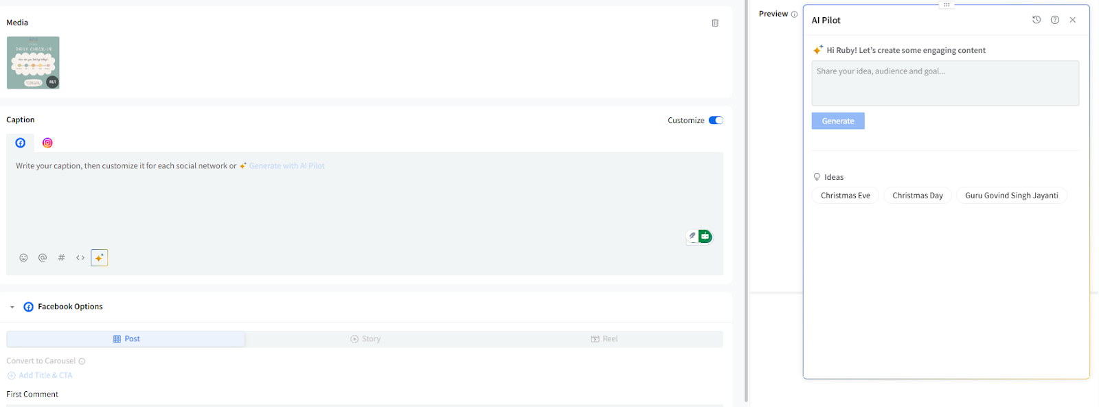 - If the caption area is empty, AI Pilot opens with prompt ideas.