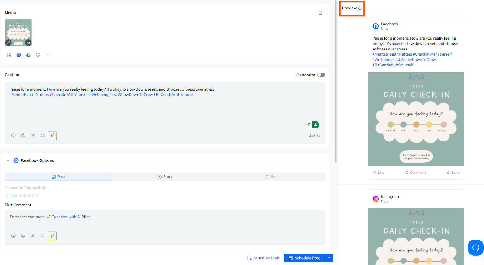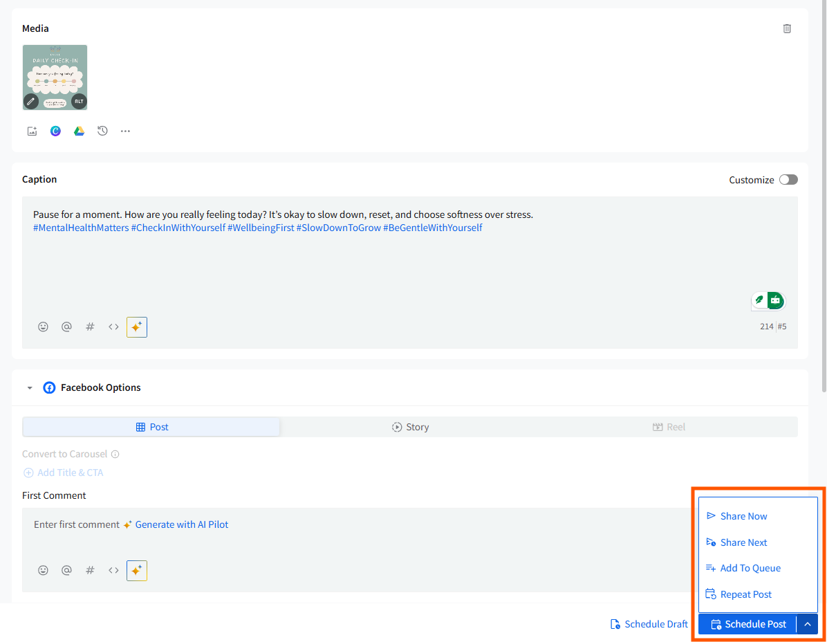 - The caption box includes emojis, hashtag sets from your Library, and Custom Fields.