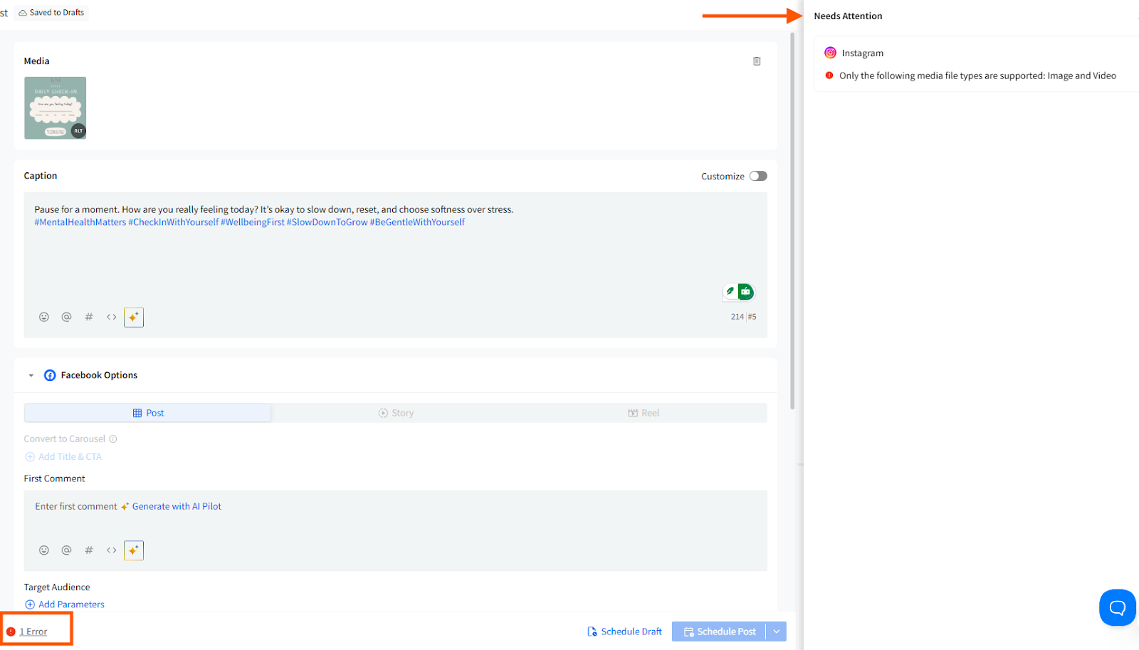 - Clicking it opens the error panel on the right, showing what needs attention before scheduling.