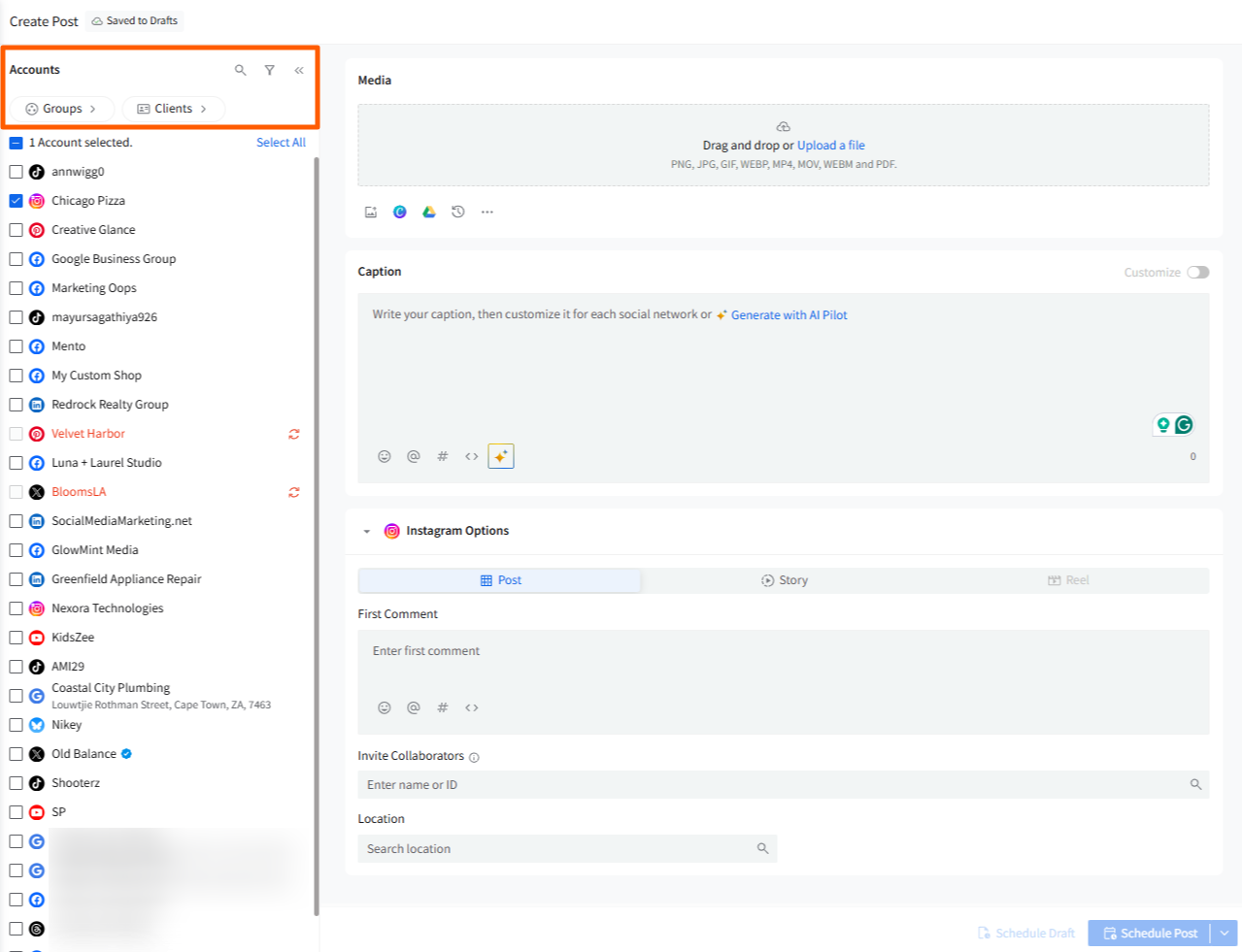 - Create Groups: If you want to create and share content over the same set of social media accounts regularly, and you don’t want to select the accounts individually each time, you can create groups of accounts to easily queue posts with a single click.
