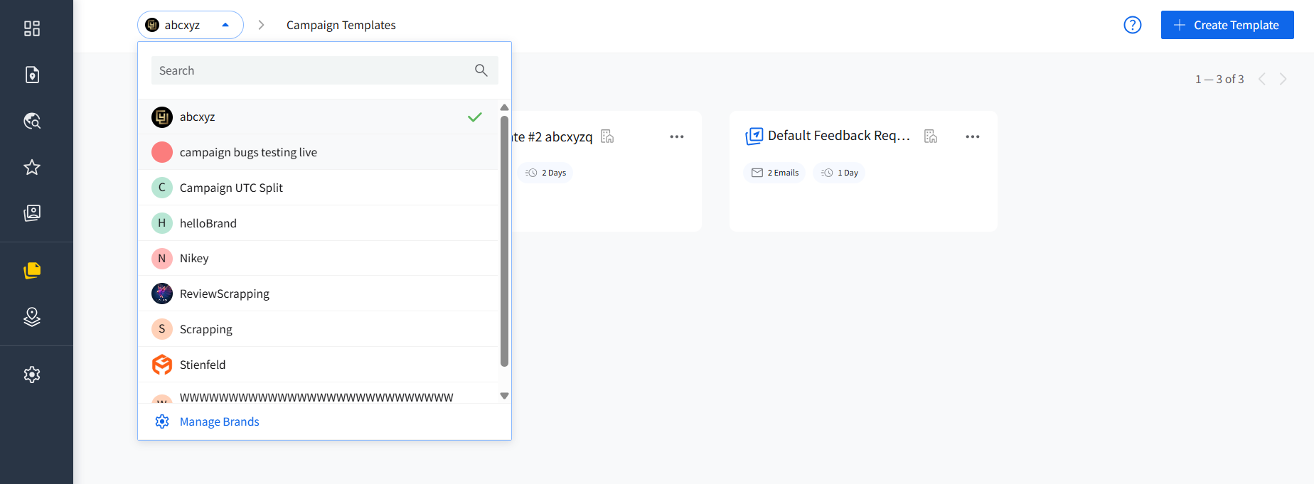 Since templates are saved under all brands or specific brands, their visibility depends on the brand you have currently chosen.