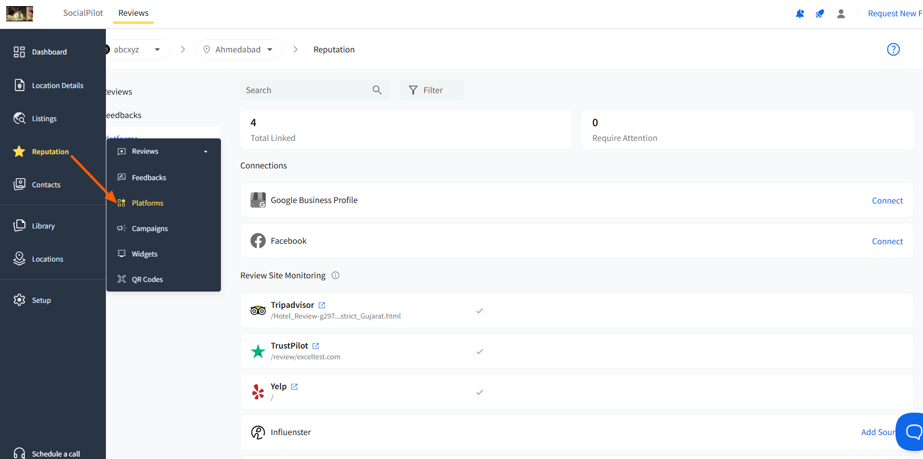 - Log in to SocialPilot Reviews and go to the Platforms page. Make sure to pick the right brand and location.