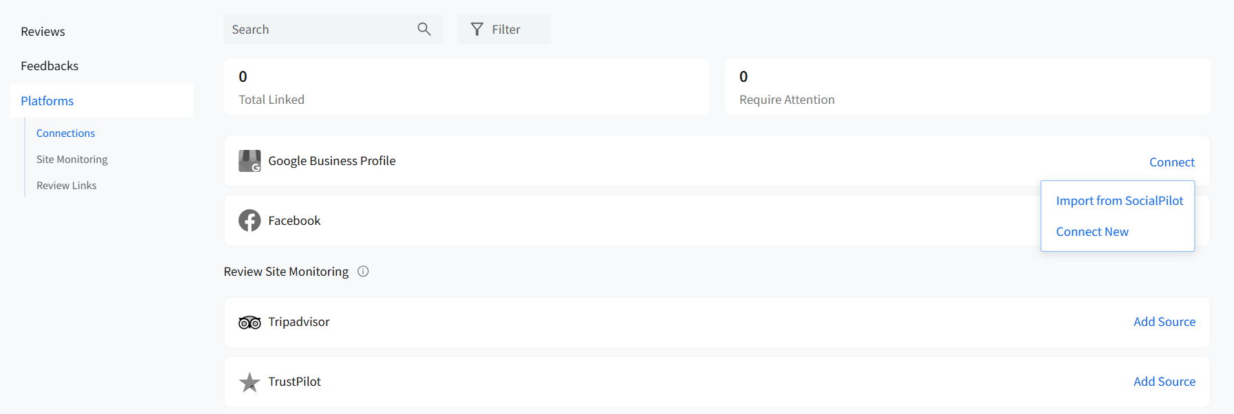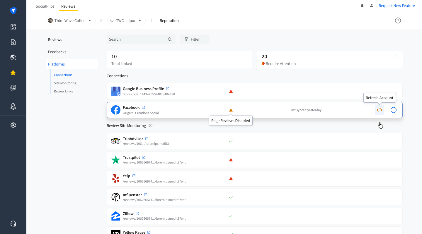 There are multiple actions you can take to manage your review platforms from the Platforms page in SocialPilot Reviews.