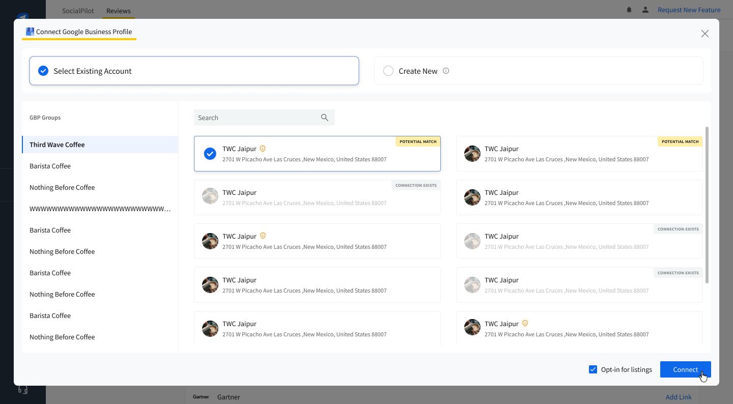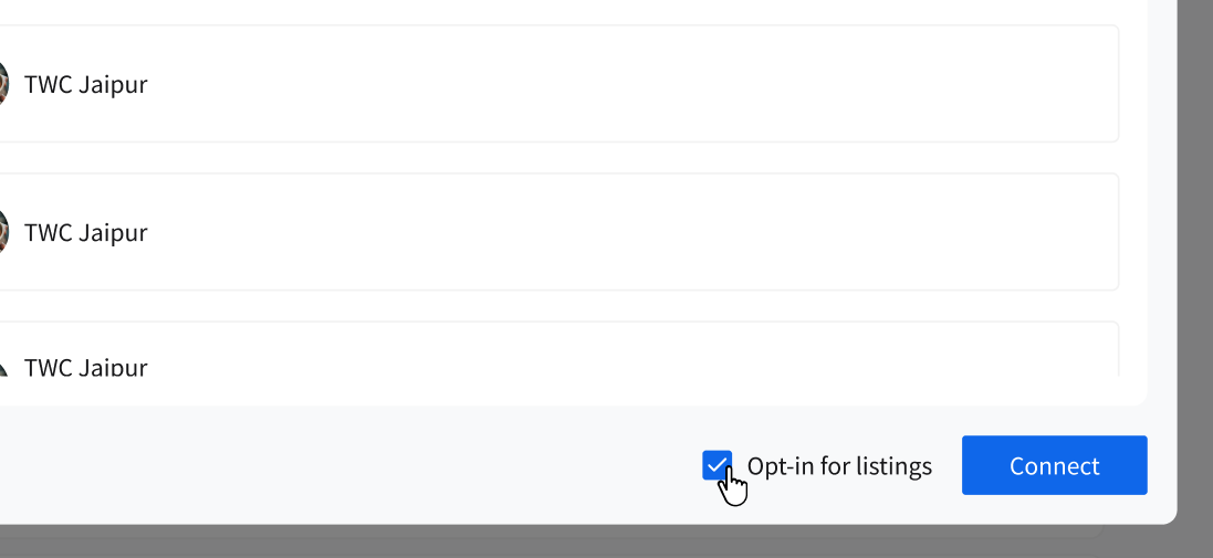 When you are selecting an account to connect as a Review platform, you will find a checkbox at the bottom of the pop-up saying Opt-in for listings.