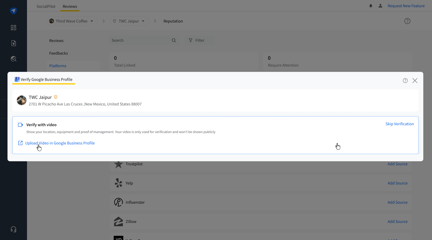 - Pending verification: If the account is not verified, SocialPilot will prompt you to authenticate and grant permissions to sync reviews.