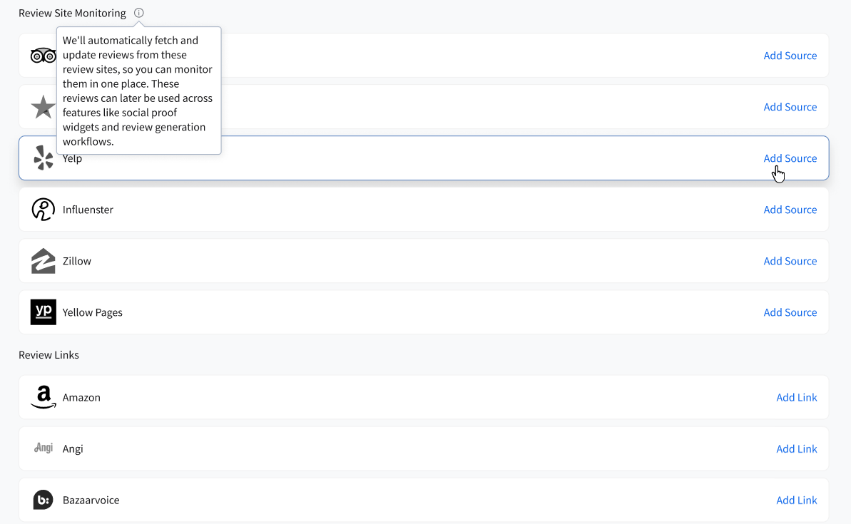 The review platform integrations are grouped into three categories with slightly varied capabilities. They are Connections, Review Site Monitoring, and Review Links.