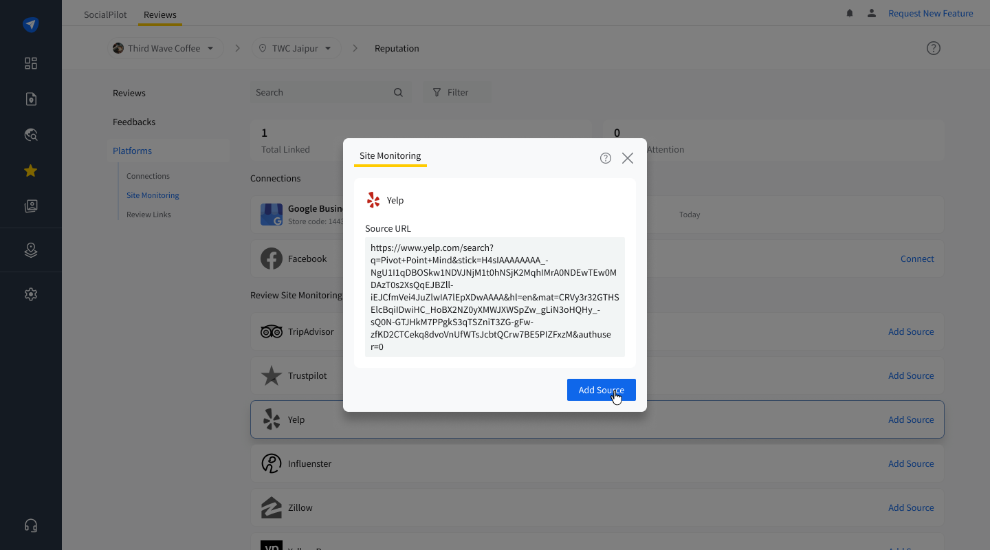 Add the URL of your business account for that platform and click on Add Source or Add Link at the bottom of the pop-up.