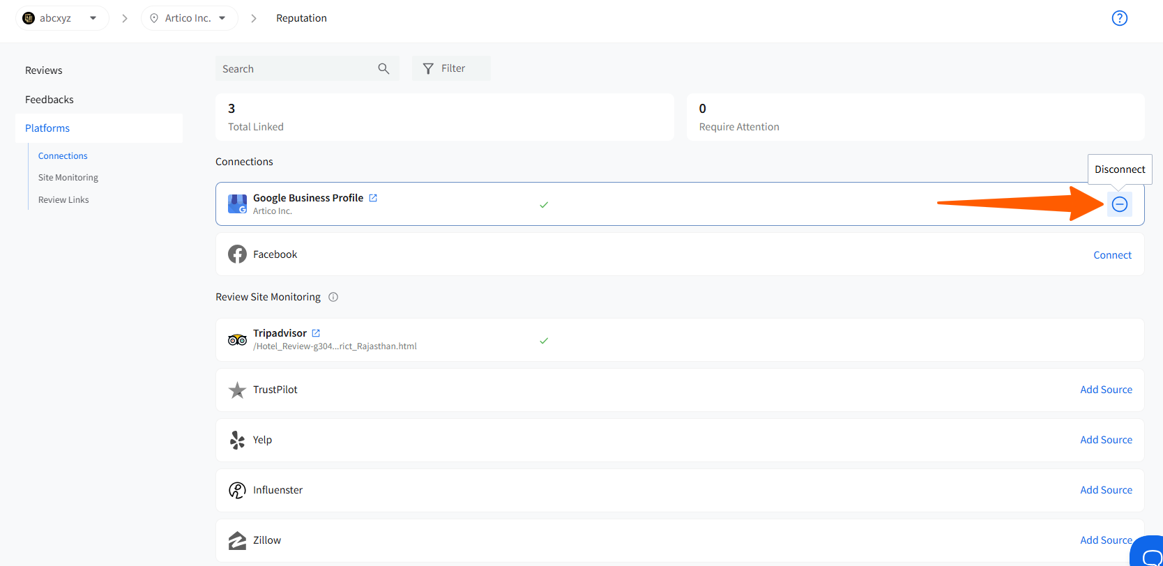 Now go to the connected review platform and locate the disconnect button in the right corner. The button will vary depending on the category of the platform.