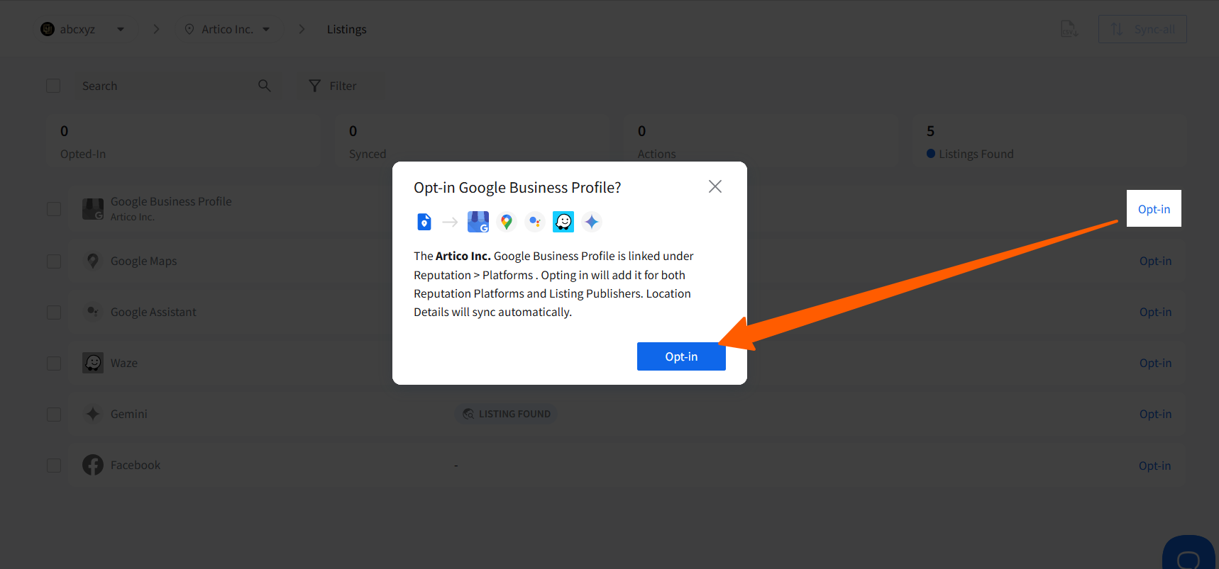 If you have connected GBP as a Review Platform without opting it in as a listing publisher for the same location, you will see “Listing Found” for that GBP publisher card.