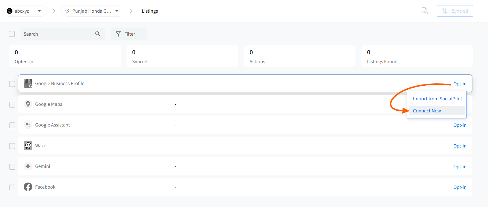 i ) Click on Opt-in on the Listings page and select Connect New.