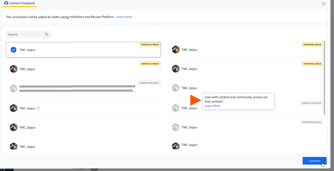 The process to add a Facebook listing is similar to adding a GBP listing. There are just a couple of differences when you want to connect a Facebook page as a listing publisher.