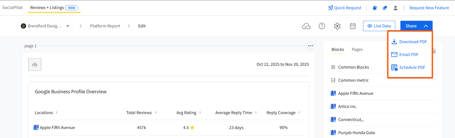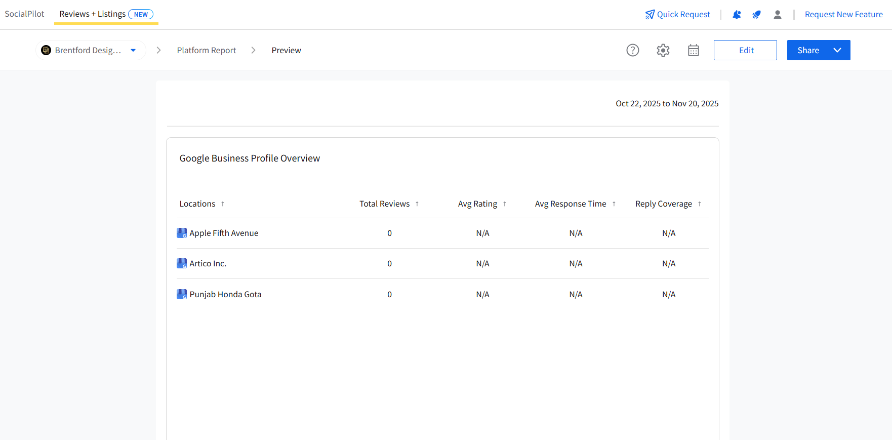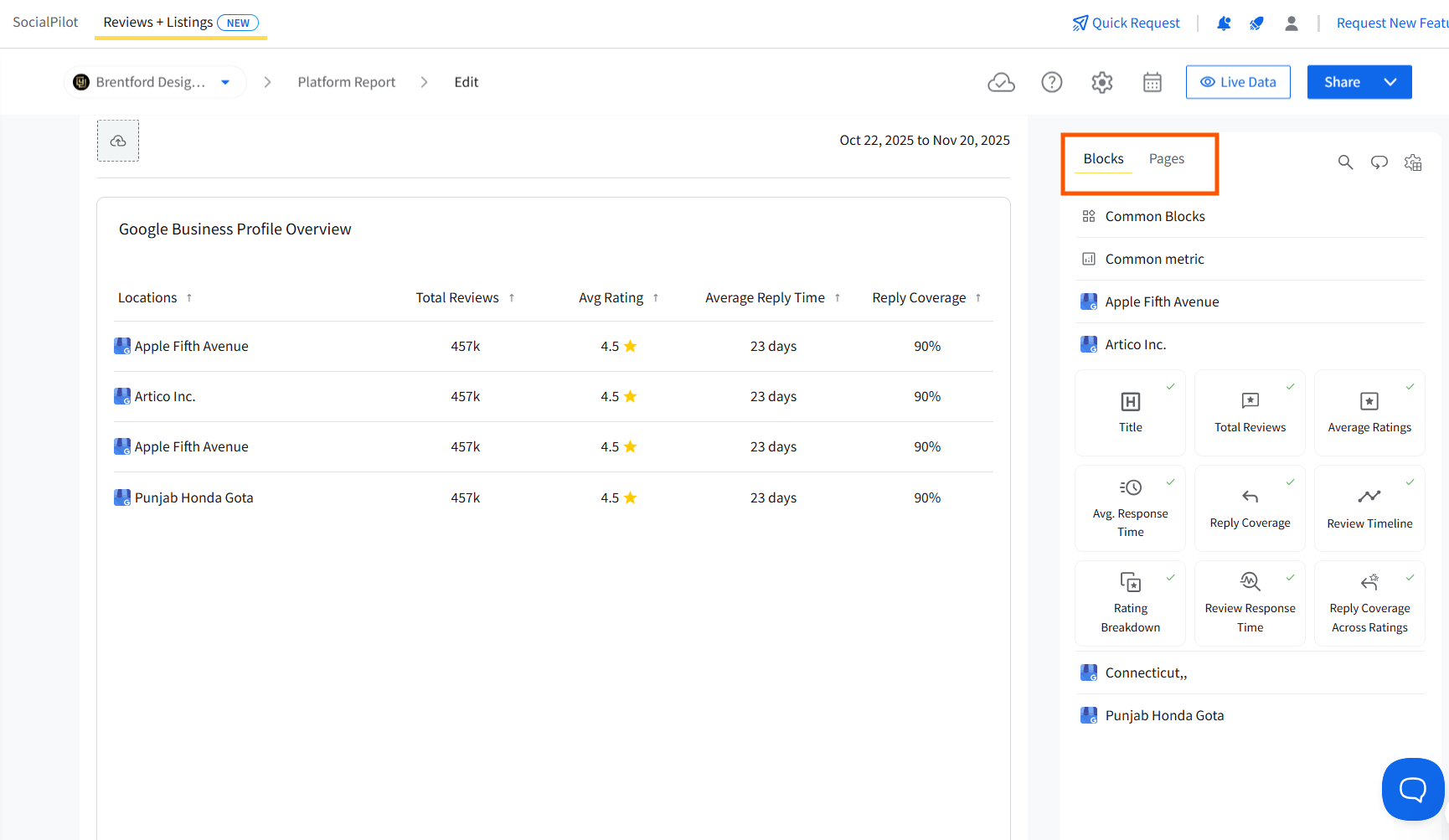 Platform Reports in SocialPilot Reviews let you view, analyze, and compare performance data from all your connected review platforms in one place. Each platform automatically generates its own report under the associated brand, helping you monitor reviews, track growth, and identify trends effortlessly.