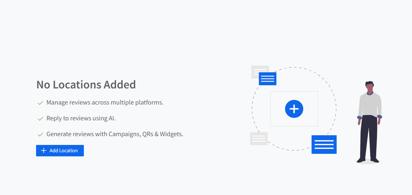 If no locations are added under a brand, you’ll see a default landing page encouraging you to add a location. Once a location is added, its report is created automatically, and live analytics begin to populate.