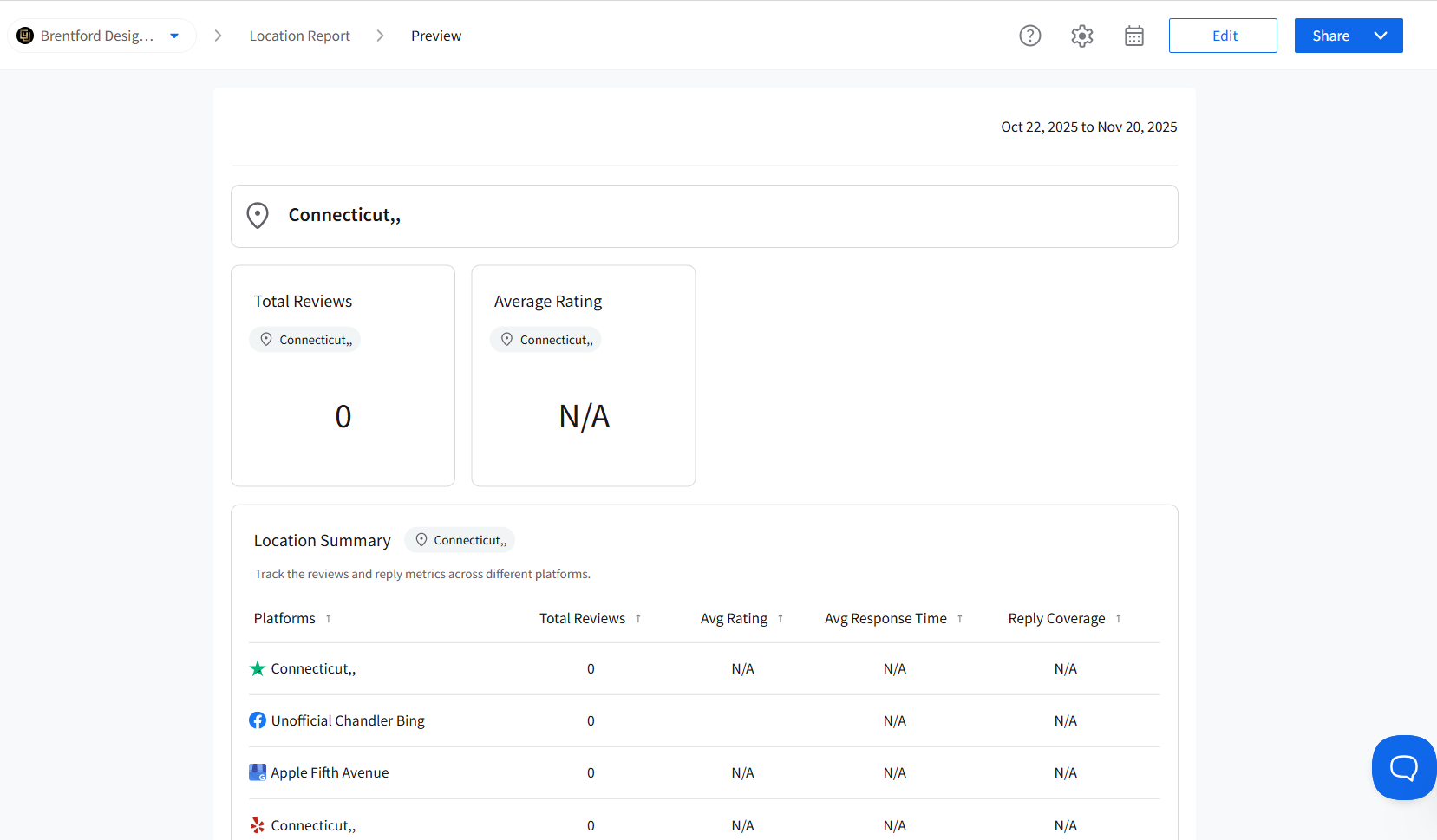 - Click on the Location Report you want to edit and open it in View Mode, where live analytics for the last 30 days are displayed.