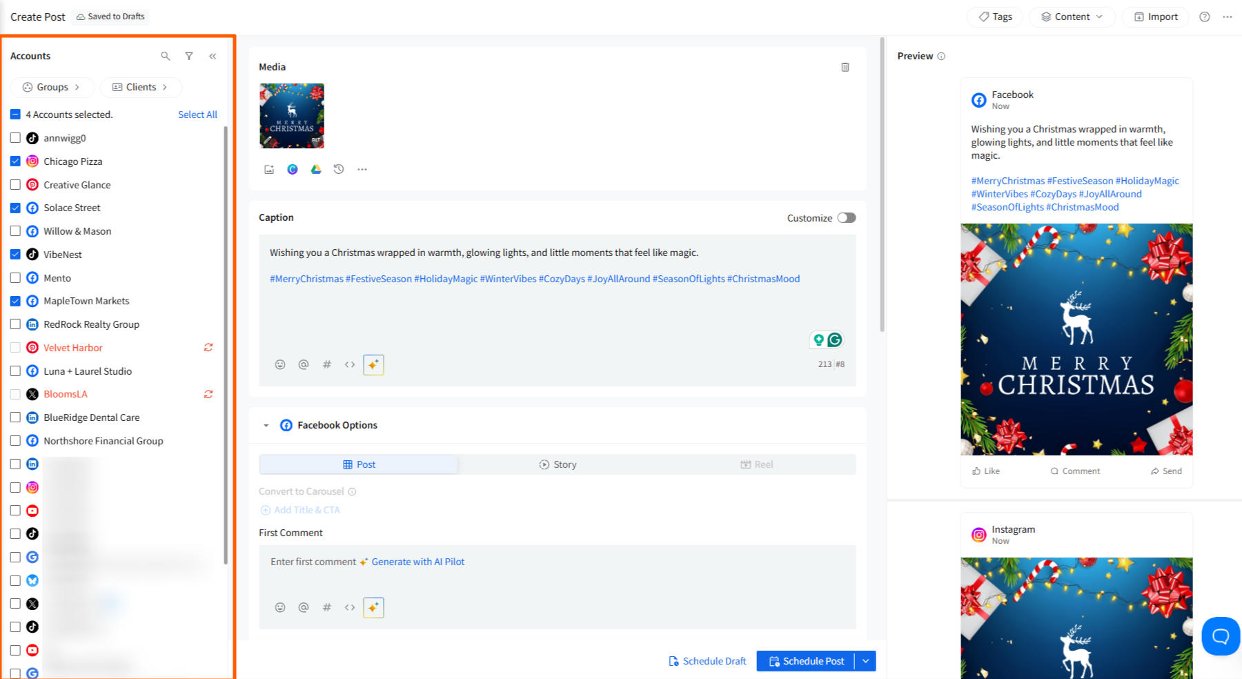 Post previews load in the right-side panel only when needed and update automatically as you edit the content or media.