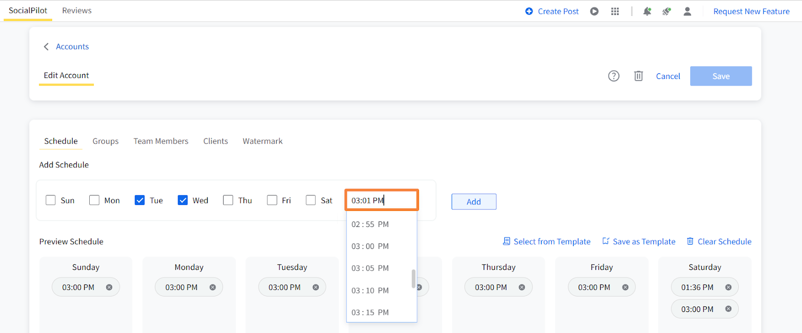 6. Once you have selected the time interval, SocialPilot will automatically calculate and display the staggered publishing times for each account. The order in which the posts will be published across the accounts is typically chosen alphabetically.