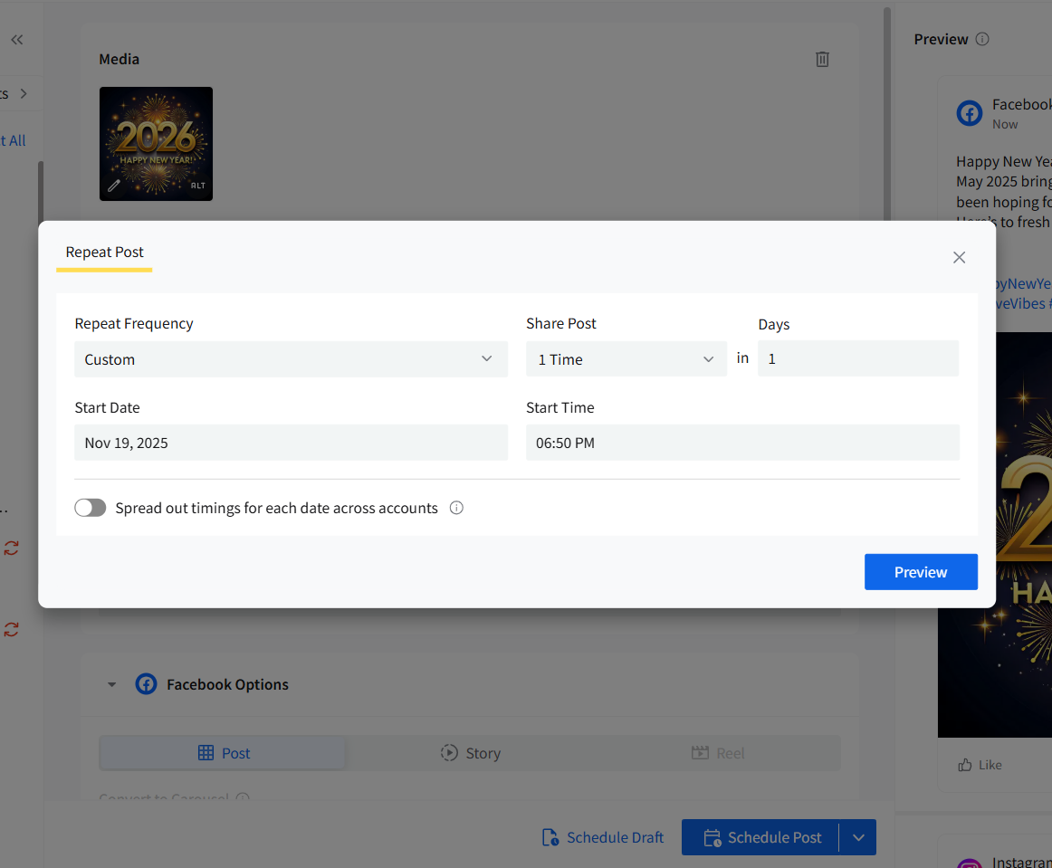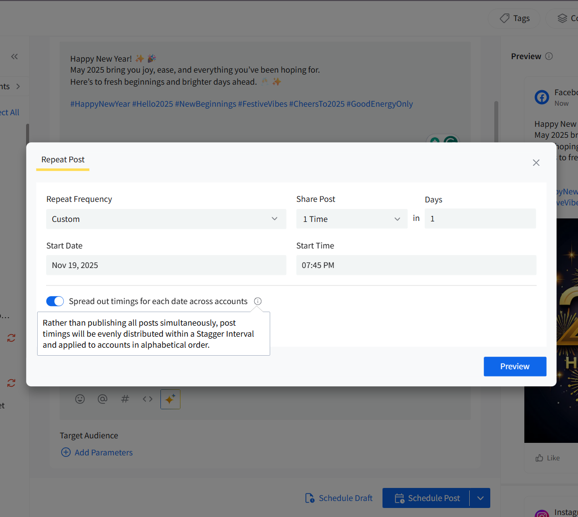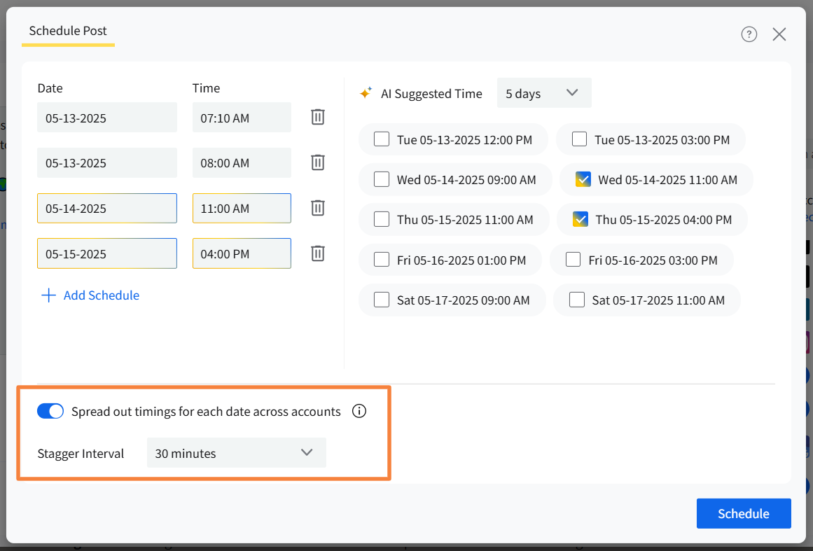 - Preview your repeat schedule and adjust as needed. You can also stagger these posts across accounts or use AI-suggested times.