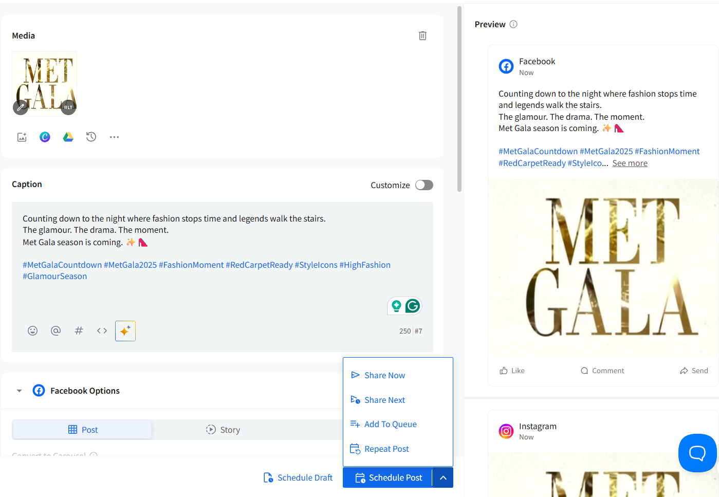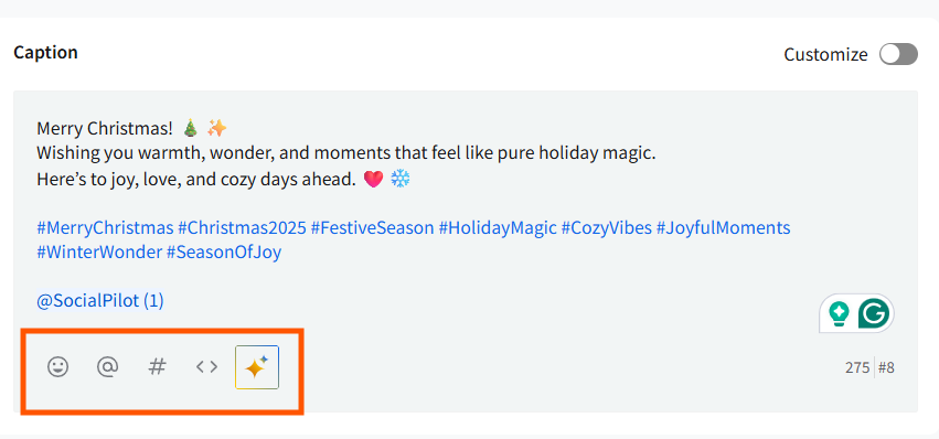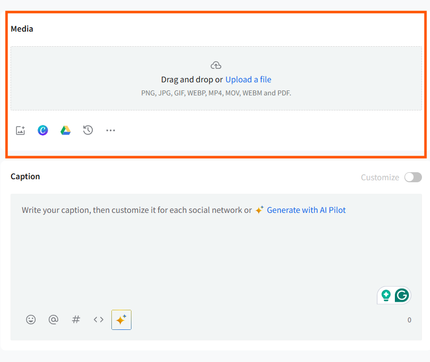 - Enter your caption in the Content Space. This area includes only caption-related tools, such as custom fields, mentions, emojis, and hashtags, keeping the writing experience focused and clutter-free.