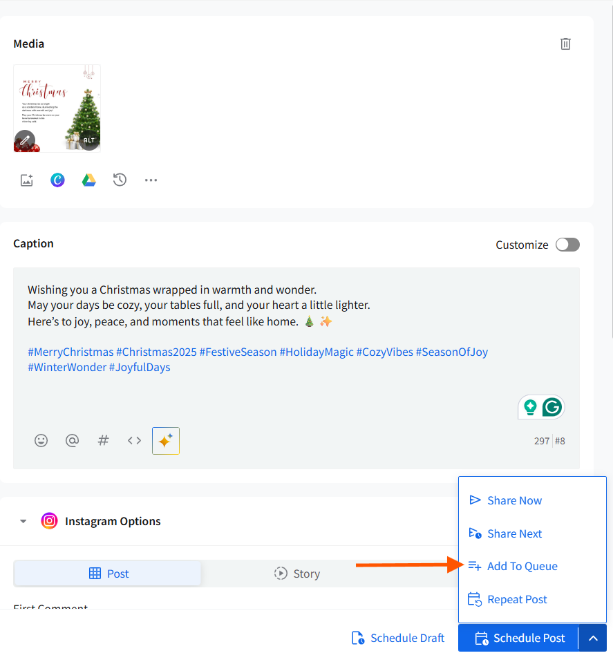 The Add to Queue option schedules your post into the predefined time slots you set for each account.