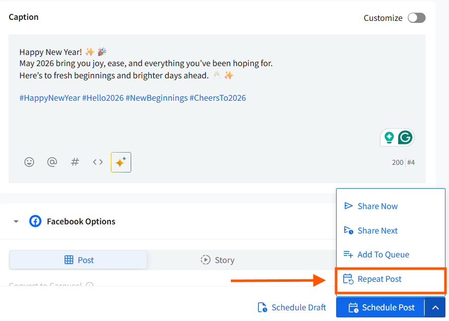 - Once you have created the post, go to the scheduling options and select Repeat Post from the Add to Queue dropdown.