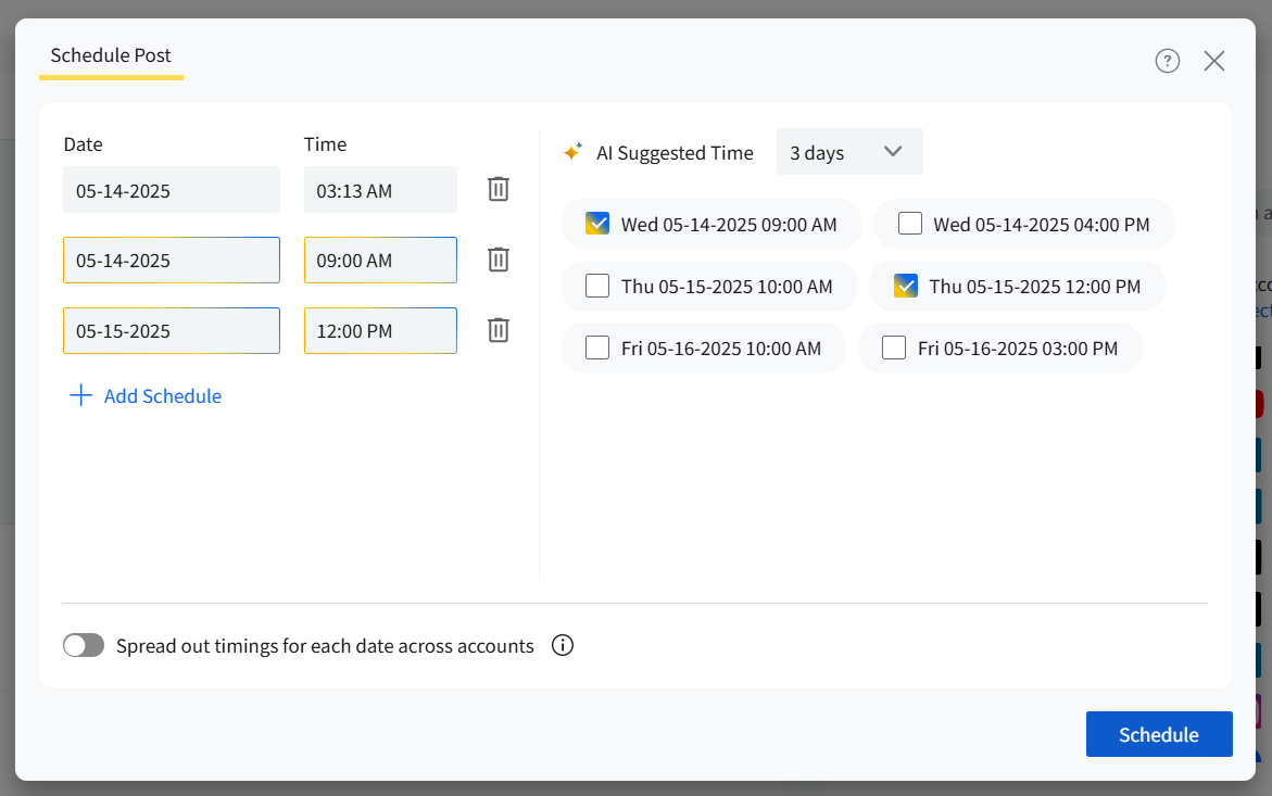 Schedule Post: Select a specific date and time or choose AI-suggested times.