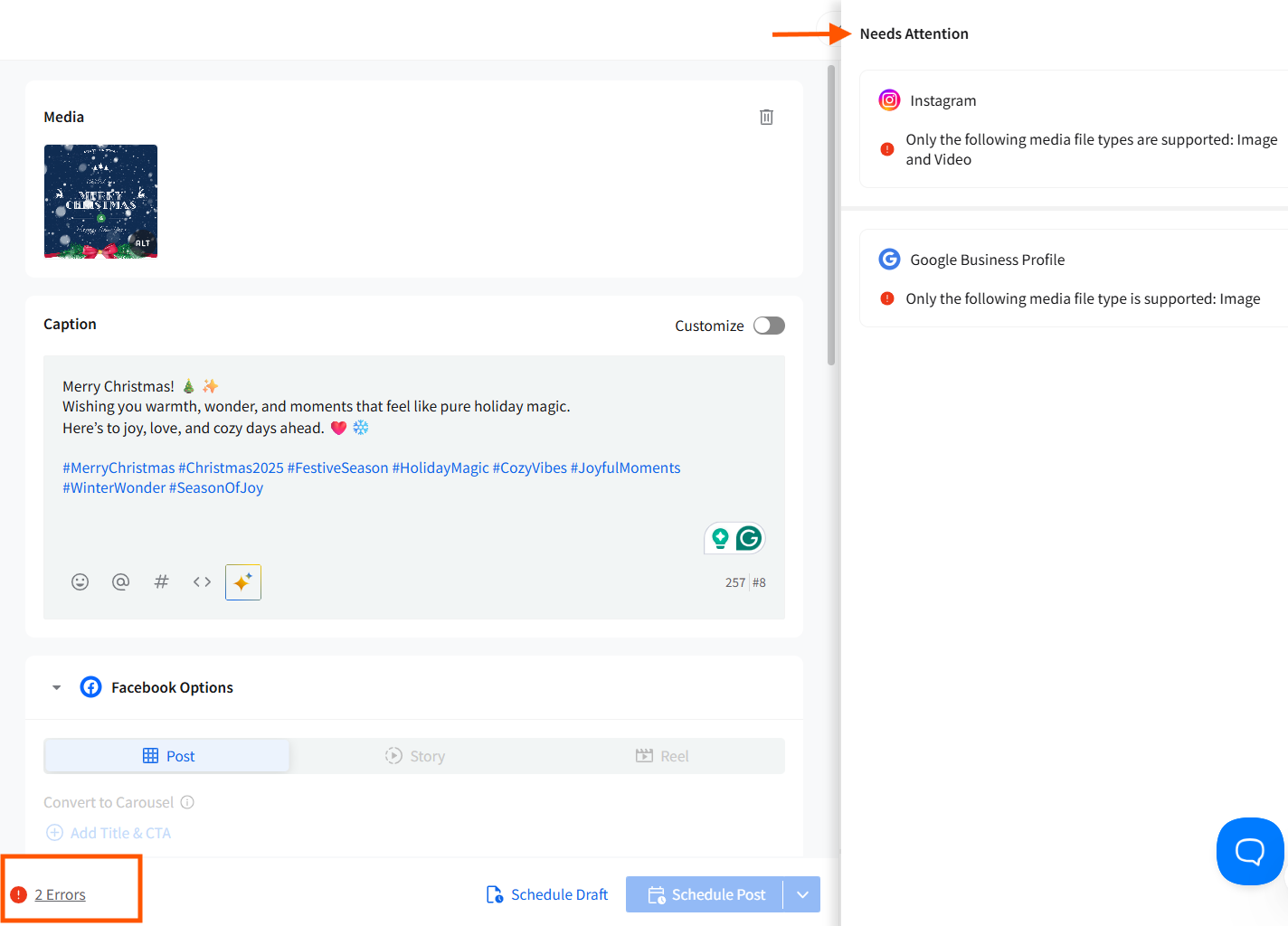 📋 Note: If something needs attention, like missing media, unsupported content, or a platform requirement, an error message will guide you before scheduling.