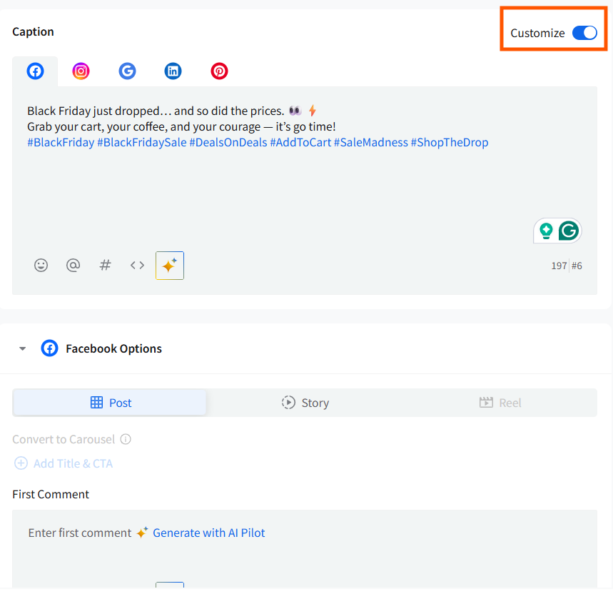 ✔️ When turning it OFF, all platform-specific edits will be replaced by the main caption. A confirmation will appear before this happens.