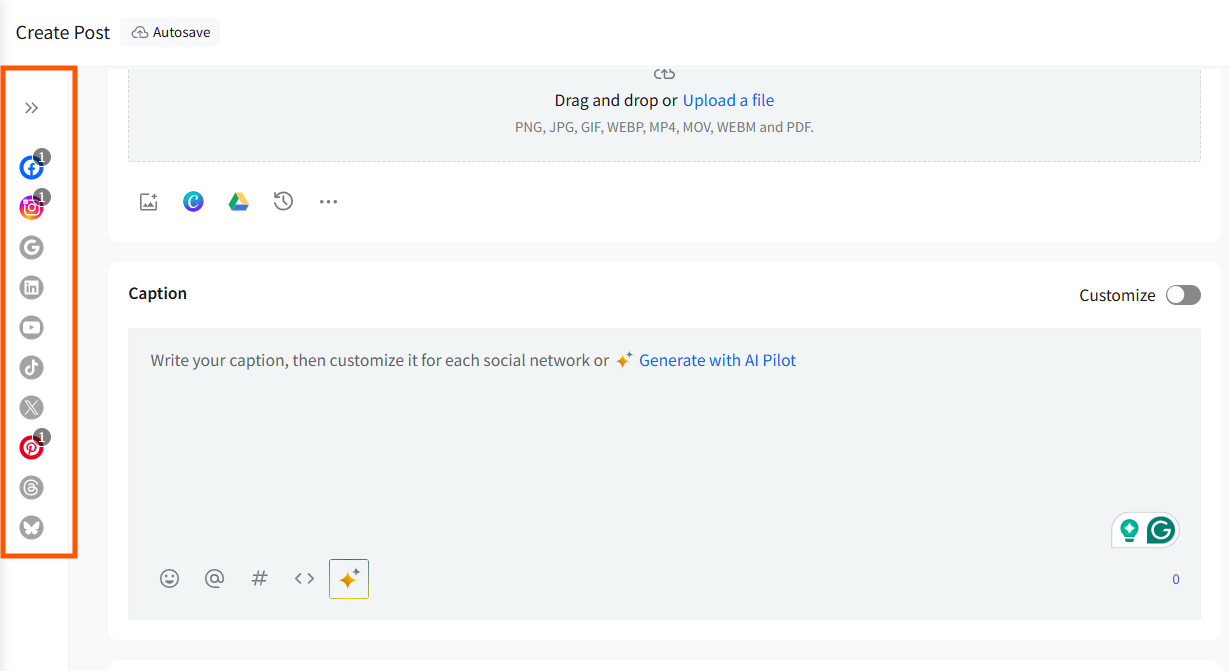 When you open Create Post, you’ll see all your connected social accounts listed on the left.