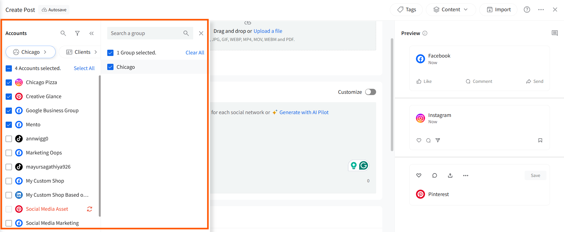 The new Create Post experience in SocialPilot gives you a cleaner, more intuitive way to select the right accounts before you begin crafting your content. The Accounts, the Groups and Clients panel now brings all your connected profiles into one organized space, helping you quickly choose where your post will be published. No more switching tabs.