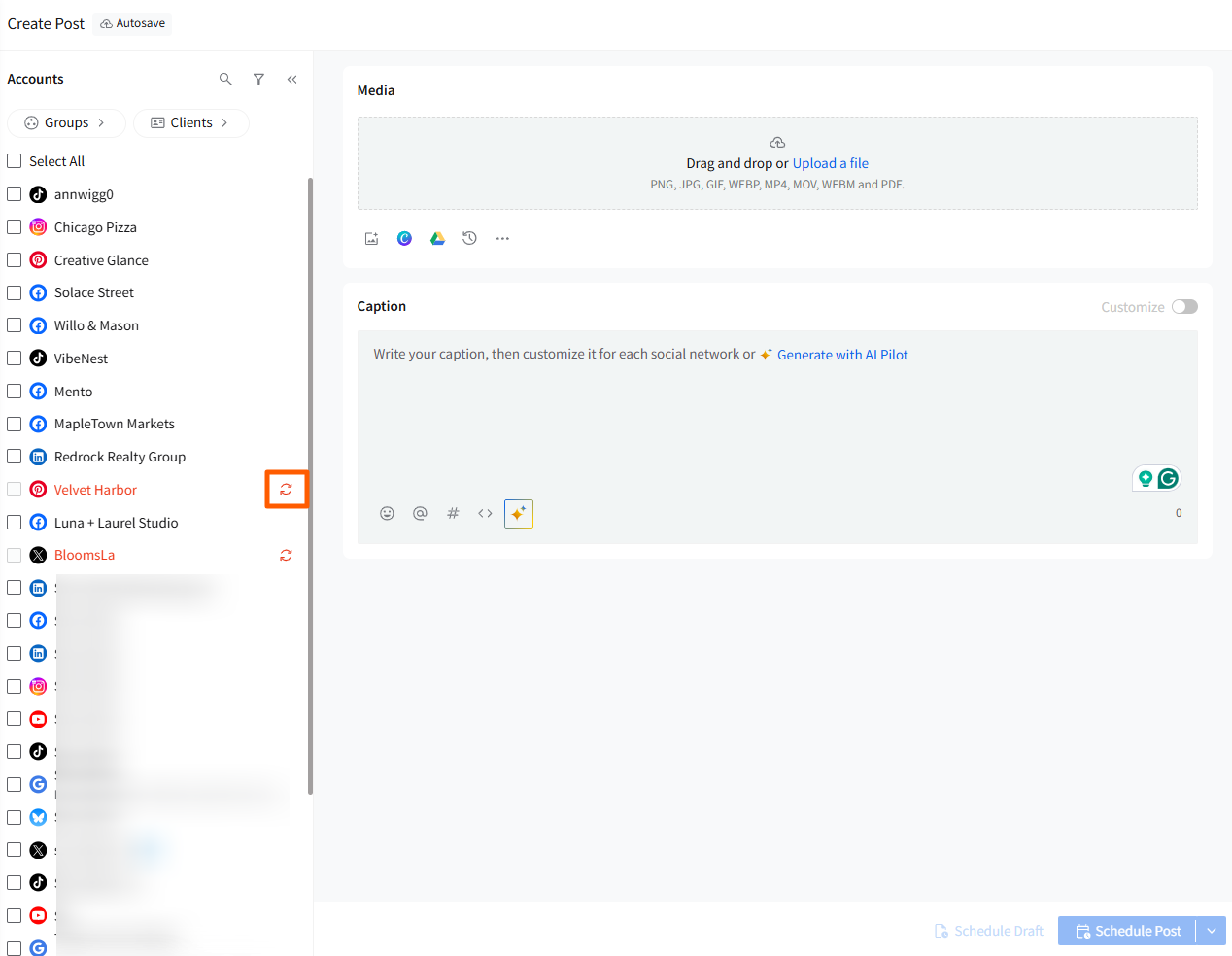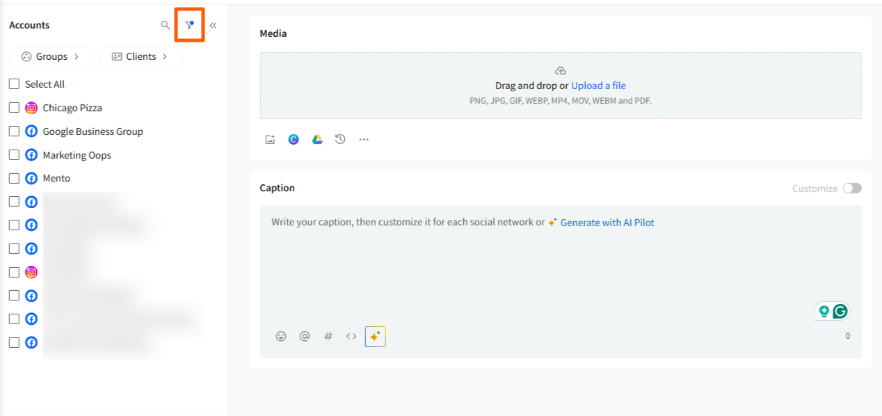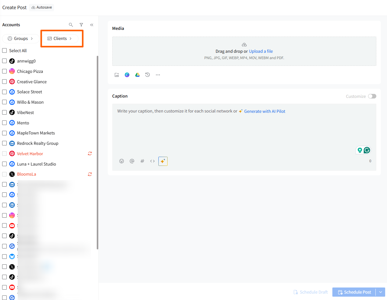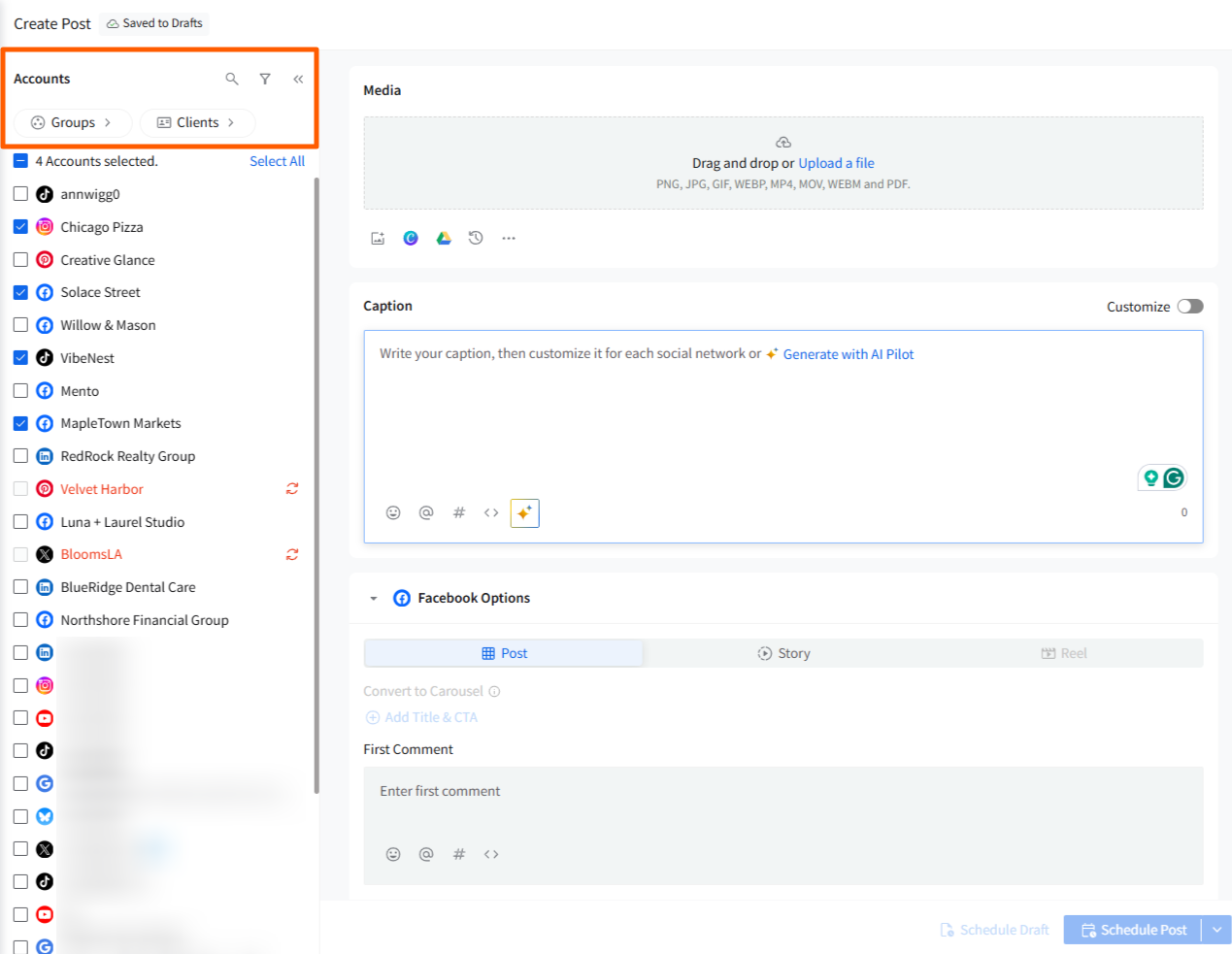 With platform filters, alphabetical sorting, issue indicators, and easy access to Groups and Clients, the panel ensures your account selection process is faster and far more structured. You can also collapse it when needed to create more room for writing while still keeping your selected accounts visible.