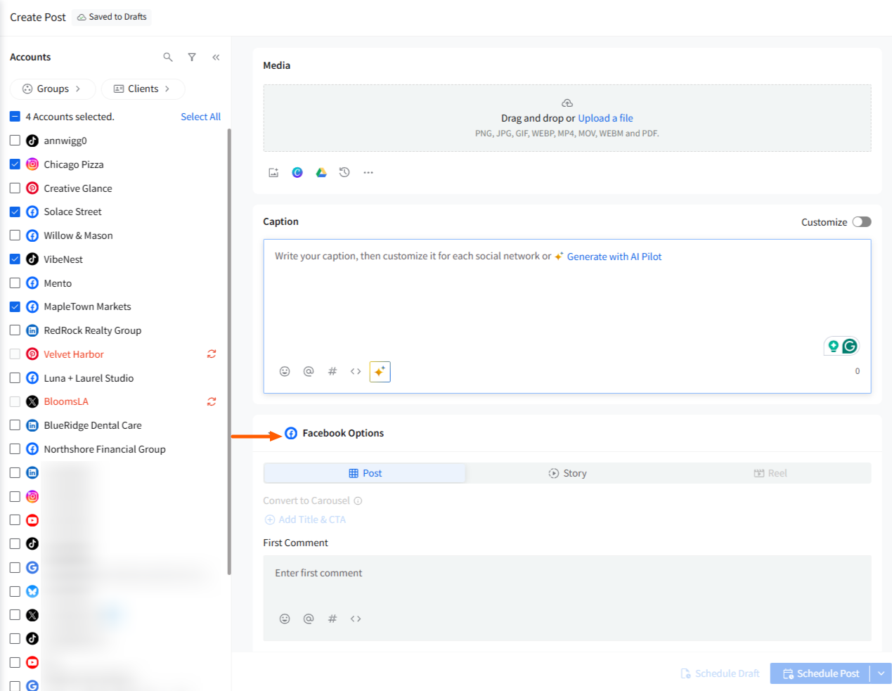 - The selected account(s) will instantly activate relevant platform options under the Caption box.