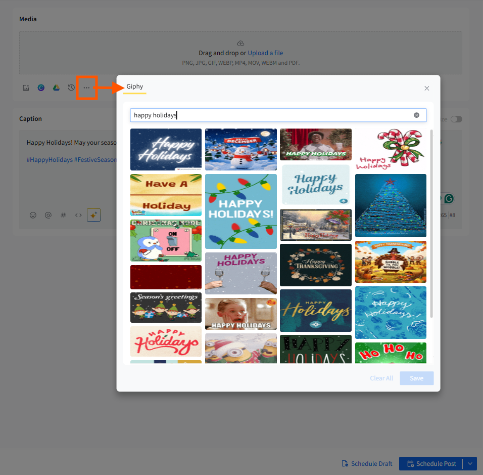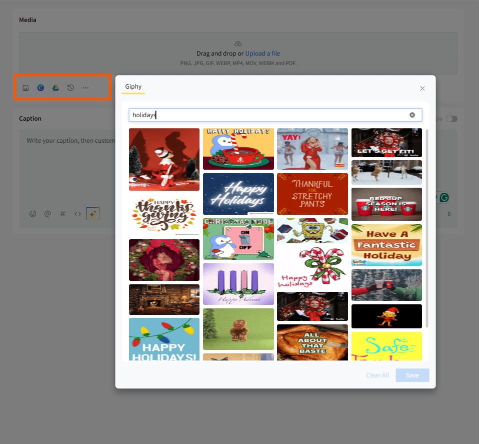 - To add a GIF in the Media section, open the External Sources menu and select Giphy. Search for a keyword, browse the results, and click the GIF you want to add.