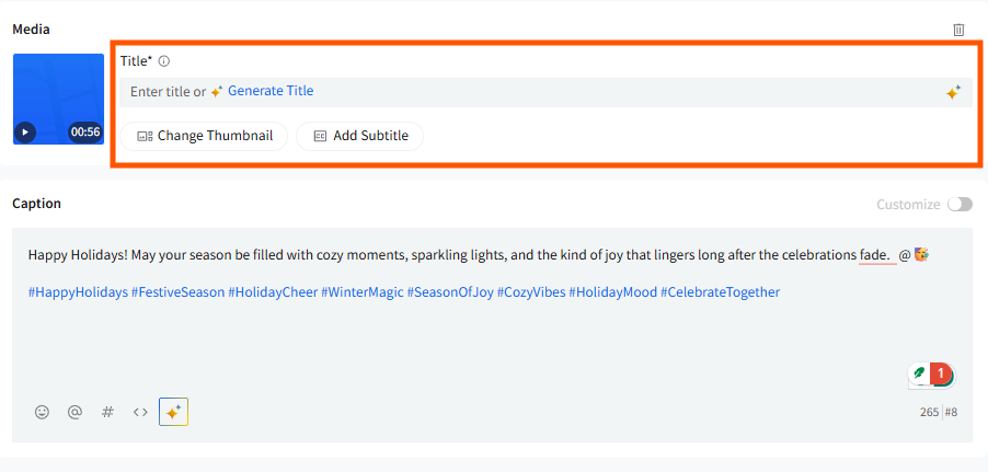In the Media section, upload a single video from your local device or connected cloud sources.